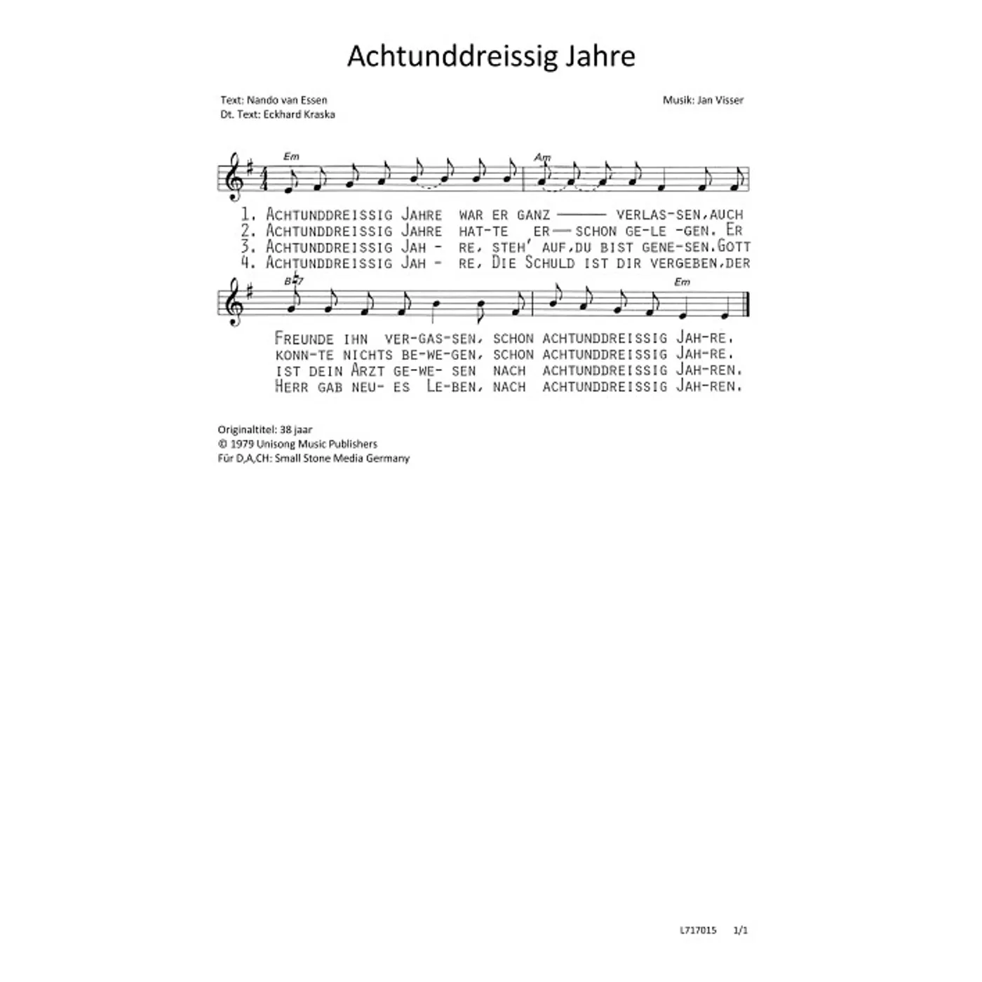 Dies ist ein Download-Artikel und kann nach dem Kauf digital heruntergeladen werden. Vorschau Nando van Essen (Komposition) Jan Visser (Text) Eckhard Kraska (Übersetzung) Achtunddreißig Jahre einstimmig mit Akkorden (Noten - Download) Bitte beachten Sie: Downloads sind aktuell nur in Deutschland erhältlich. Bitte wählen Sie aus, für wie viele Kopien/Ausdrucke Sie eine Lizenz erwerben möchten. Die Lizenz wird entsprechend auf dem Dokument vermerkt. 1,50 € Sofort Lieferbar (per Download) Günstige Mengenpreise verfügbar Günstige Mengenpreise (DE) Kaufen Sie 2 zum Preis von je 1,43 € und sparen Sie 5% Kaufen Sie 10 zum Preis von je 1,35 € und sparen Sie 10% Kaufen Sie 25 zum Preis von je 1,28 € und sparen Sie 15% Kaufen Sie 50 zum Preis von je 1,20 € und sparen Sie 20% Kaufen Sie 100 zum Preis von je 1,13 € und sparen Sie 25% Lizenz pro Kopie/Ausdruck: Bestellen Sie den Artikel jetzt auf: Informationen zur Lizenz Details Verlag: Small Stone Media Artikel-Nr.: W80035092 Originaltitel: 38 jaar Tonart: E-Moll Satz: einstimmig, mit Akkorden Seitenzahl: 1 S. Hinweise: DIN A4 Dateigröße insg.: 166,2 Kilobyte Dieses Produkt ist preisgebunden: Ja Download-Material: L717015 (PDF) Angaben zum Hersteller nach GPSR: Gerth Medien i.d. SCM Verlagsgruppe GmbH Berliner Ring 62 35576 Wetzlar DEUTSCHLAND info@scm-verlagsgruppe.de Weitere Details Weitere Varianten Noten-Downloads Achtunddreißig Jahre (diese Variante haben Sie gerade ausgewählt) (einstimmig, mit Akkorden, E-Moll) Nando van Essen (Komposition), Jan Visser (Text), Eckhard Kraska (Übersetzung) einstimmig, mit Akkorden, E-Moll 1,50 € Die Preise stellen die Einzelpreise der jeweils verfügbaren Einzeldownloads dar. Bewertungen Für dieses Produkt gibt es noch keine Rezensionen. Weitere Artikel von Nando van Essen zur Produktseite von Thomas Thomas Noten - Download 1,50 € Download zur Produktseite von Jakob Jakob Noten - Download 1,50 € Download zur Produktseite von Er kommt Er kommt Noten - Download 1,50 € Download zur Produktseite von Psalm 1 Psalm 1 Noten - Download 1,50 € Download zur Produktseite von He, Jona He, Jona Noten - Download 1,50 € Download zur Produktseite von Beim Turmbau zu Babel Beim Turmbau zu Babel Noten - Download 1,50 € Download zur Produktseite von Simson Simson Noten - Download 1,50 € Download zur Produktseite von Moses Wiegenlied Moses Wiegenlied Noten - Download 1,50 € Download zur Produktseite von Das Lied vom Fest Das Lied vom Fest Noten - Download 1,50 € Download zur Produktseite von Vier Freunde Vier Freunde Noten - Download 1,50 € Download zur Produktseite von Er ging fort von uns Er ging fort von uns Noten - Download 1,50 € Download zur Produktseite von Hagar Hagar Noten - Download 1,50 € Download Alle Artikel von Nando van Essen anzeigen Das könnte Sie auch interessieren zur Produktseite von Von eins bis zehn Von eins bis zehn Noten - Download 1,50 € Download zur Produktseite von Das Schäfchen Das Schäfchen Noten - Download 1,50 € Download zur Themenseite "Knallersongs <br>für Kinder" Knallersongs für Kinder Liederbücher, Musik-CDs, Bewegungs-Videos uvw. Jetzt entdecken Jetzt entdecken
