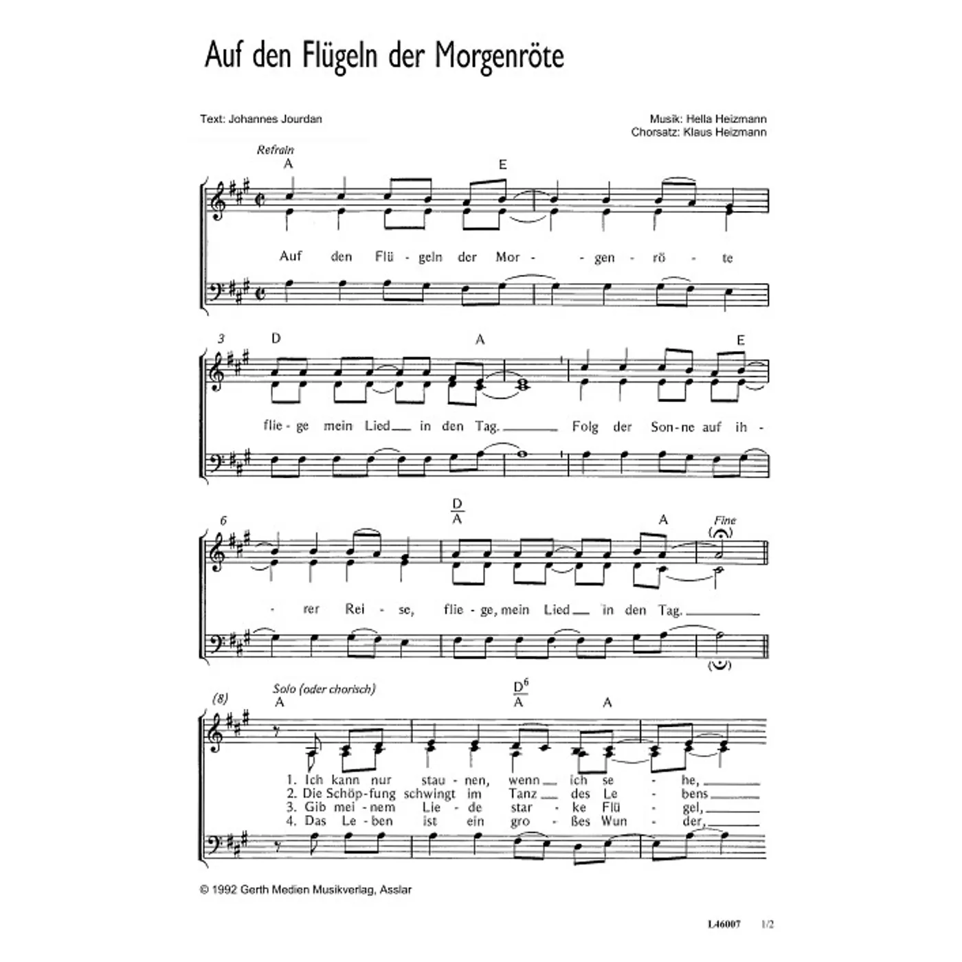 Auf den Flügeln der Morgenröte (diese Variante haben Sie gerade ausgewählt) (traditionell, dreistimmig, gemischter Chor, mit Akkorden, A-Dur) Hella Heizmann (Komposition), Johannes Jourdan (Text), Klaus Heizmann (Chorsatz) |
