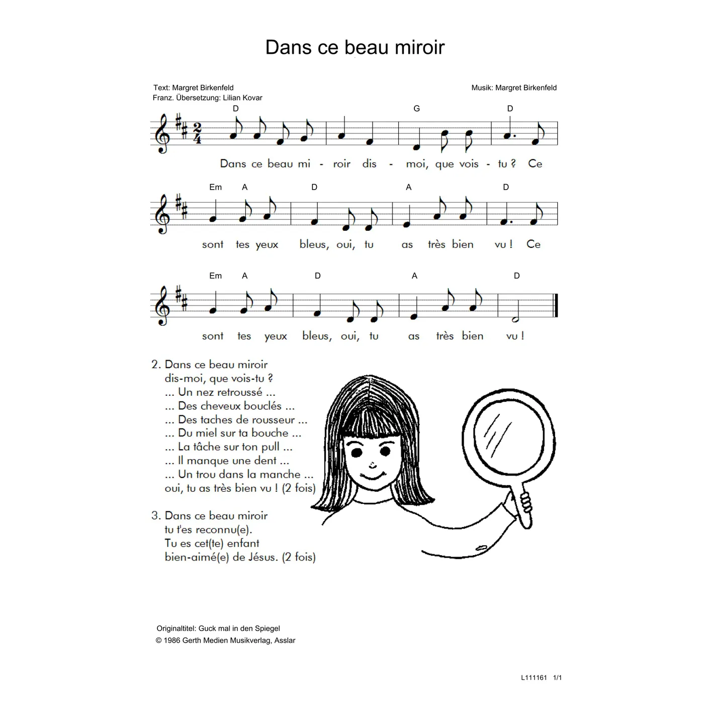 Dans ce beau miroir (diese Variante haben Sie gerade ausgewählt) (einstimmig, mit Akkorden, D-Dur) Margret Birkenfeld (Komposition, Text), Lillian Kovar, Lilian Kovar (Übersetzung) |