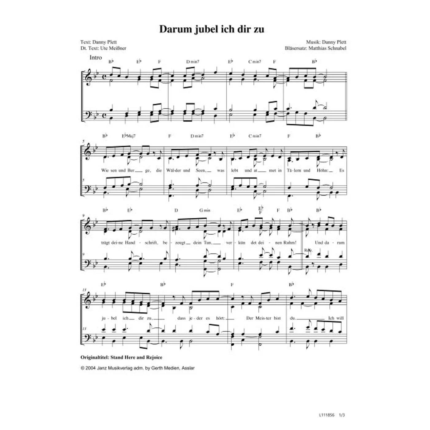 Darum juble ich dir zu (diese Variante haben Sie gerade ausgewählt) (modern, Bläser, Bläserpartitur, Partituren, mit Akkorden, B-Dur) Danny Plett (Komposition, Text), Matthias Schnabel (Bläsersatz), Ute Meißner (Übersetzung) |