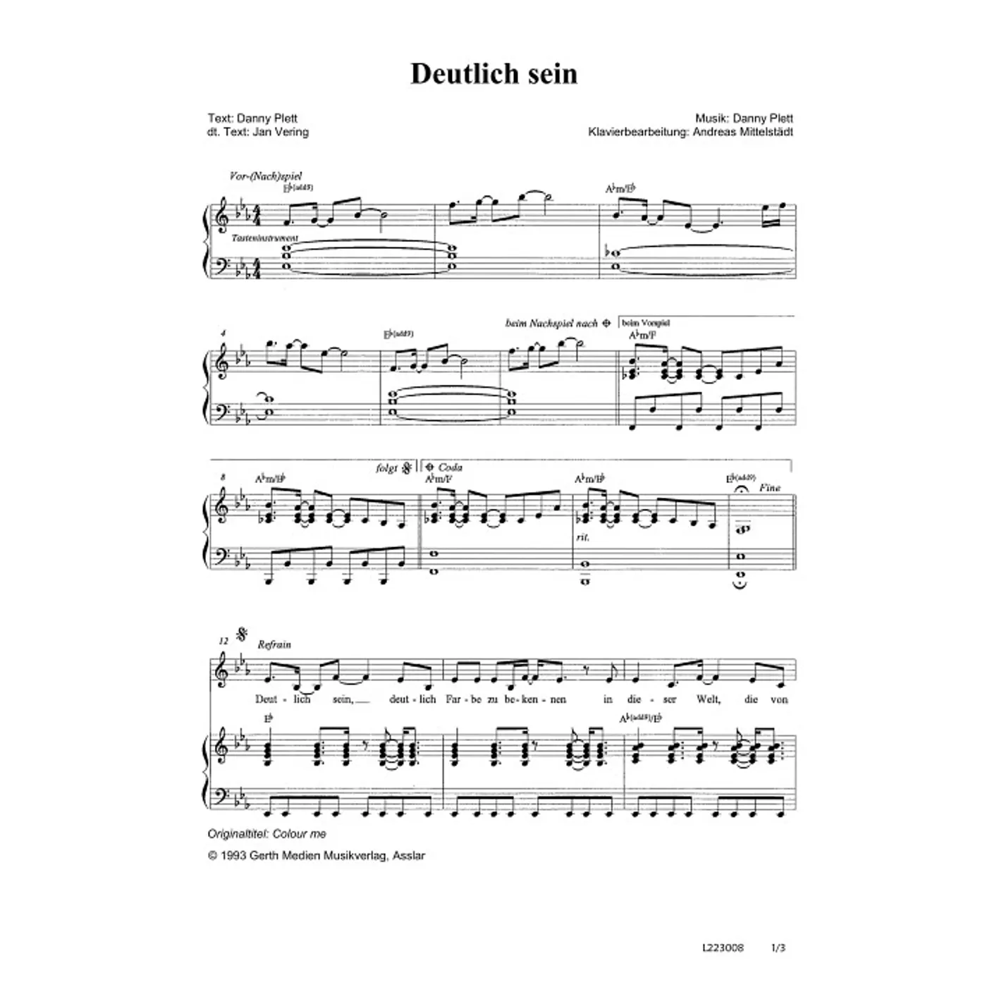 Deutlich sein (diese Variante haben Sie gerade ausgewählt) (modern, Klavier, einstimmig, mit Akkorden, Es-Dur) Danny Plett (Komposition, Text), Markus Martitz (Bearbeiter), Jan Vering (Übersetzung) |