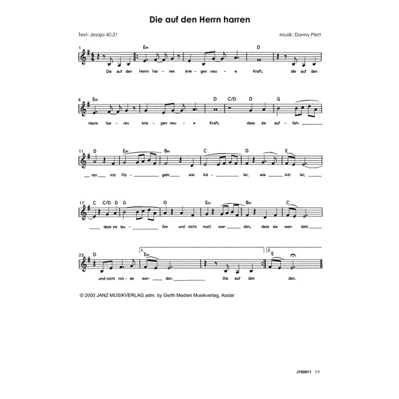 Die auf den Herrn harren (diese Variante haben Sie gerade ausgewählt) (einstimmig, mit Akkorden, E-Moll) Danny Plett (Komposition) |