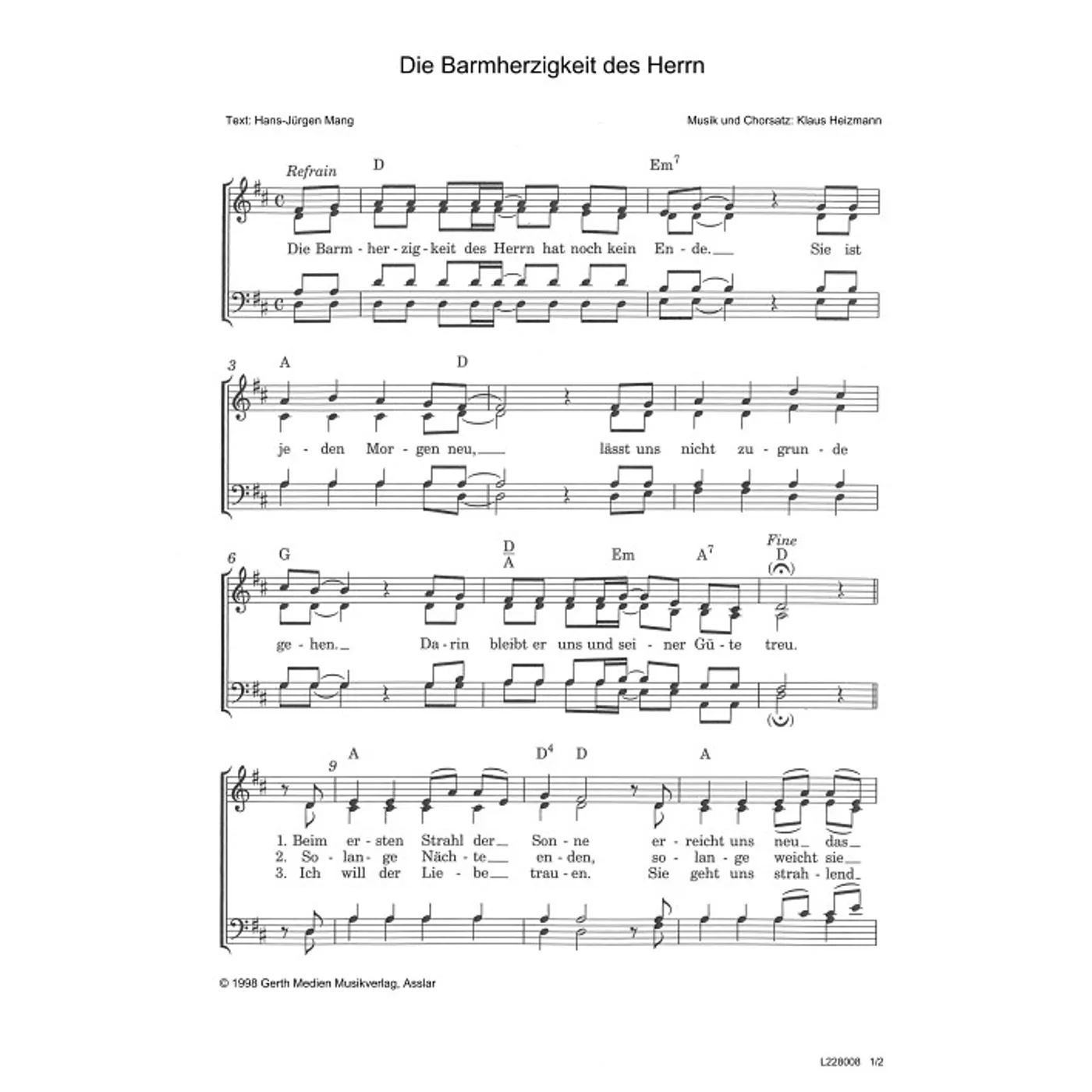Die Barmherzigkeit des Herrn (diese Variante haben Sie gerade ausgewählt) (traditionell, gemischter Chor, mit Akkorden, vierstimmig, D-Dur) Klaus Heizmann (Komposition, Chorsatz), Hans-Jürgen Mang (Text) |