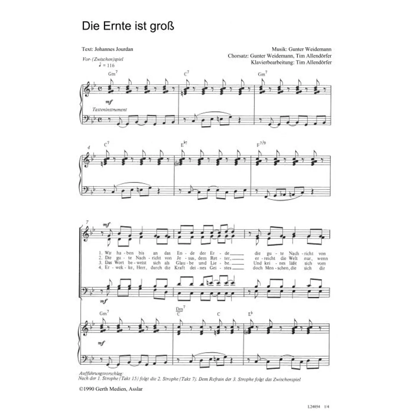 Die Ernte ist groß (diese Variante haben Sie gerade ausgewählt) (Klavier, gemischter Chor, mit Akkorden, vierstimmig, G-Moll) Gunter Weidemann (Komposition, Bearbeiter), Johannes Jourdan (Text), Tim Allendörfer (Bearbeiter) |