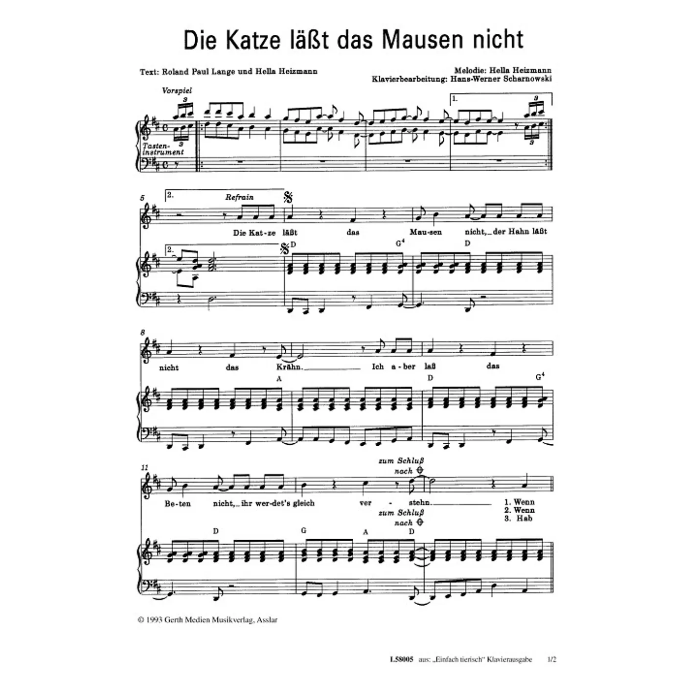 Die Katze lässt das Mausen nicht (diese Variante haben Sie gerade ausgewählt) (Klavier, einstimmig, mit Akkorden, D-Dur) Hella Heizmann (Komposition, Text), Roland Paul Lange (Text), Hans Werner Scharnowski (Klaviersatz) |