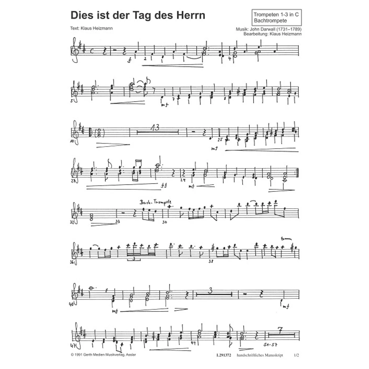 Dies ist der Tag des Herrn (Trompeten 1-3 in C / Bachtrompete) (diese Variante haben Sie gerade ausgewählt) (Orchestereinzelstimme) Klaus Heizmann (Text) |