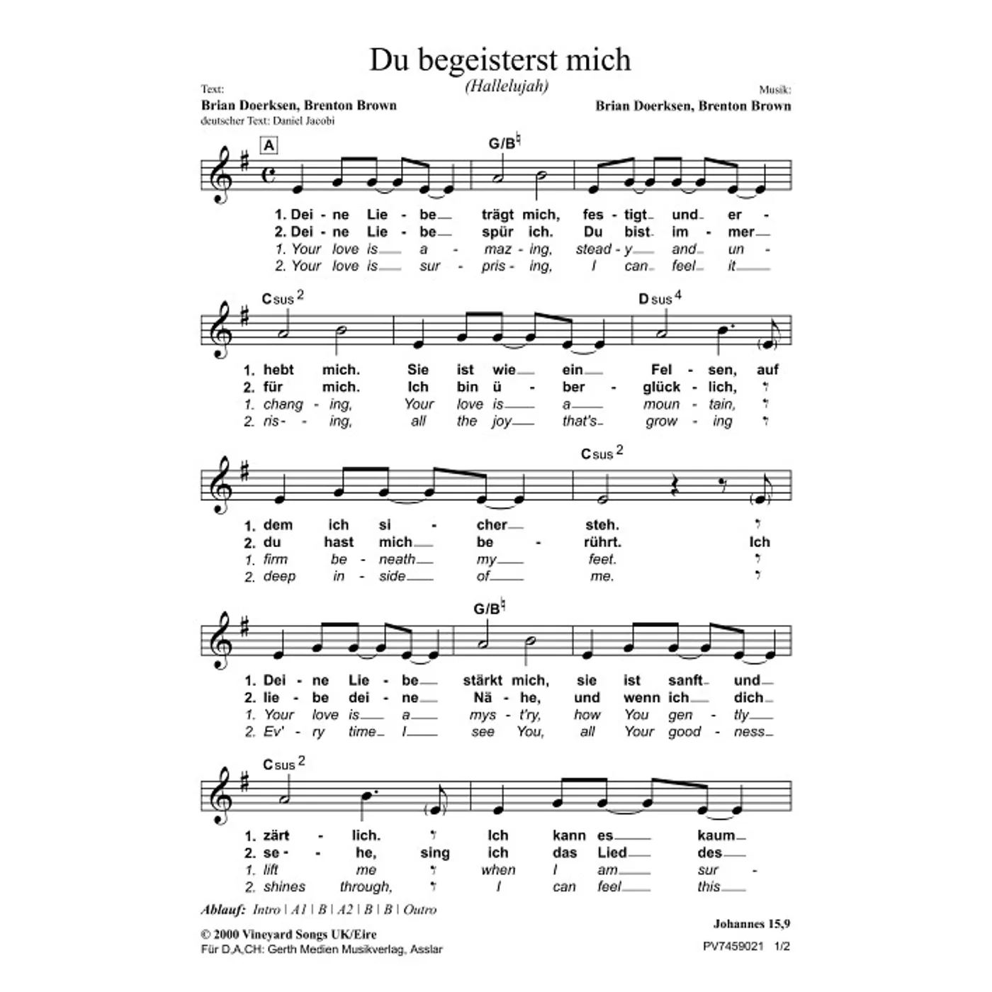 Du begeisterst mich (diese Variante haben Sie gerade ausgewählt) (einstimmig, mit Akkorden, G-Dur) Brenton Brown (Komposition, Text), Brian Doerksen (Komposition, Text), Daniel Jacobi (Übersetzung) |
