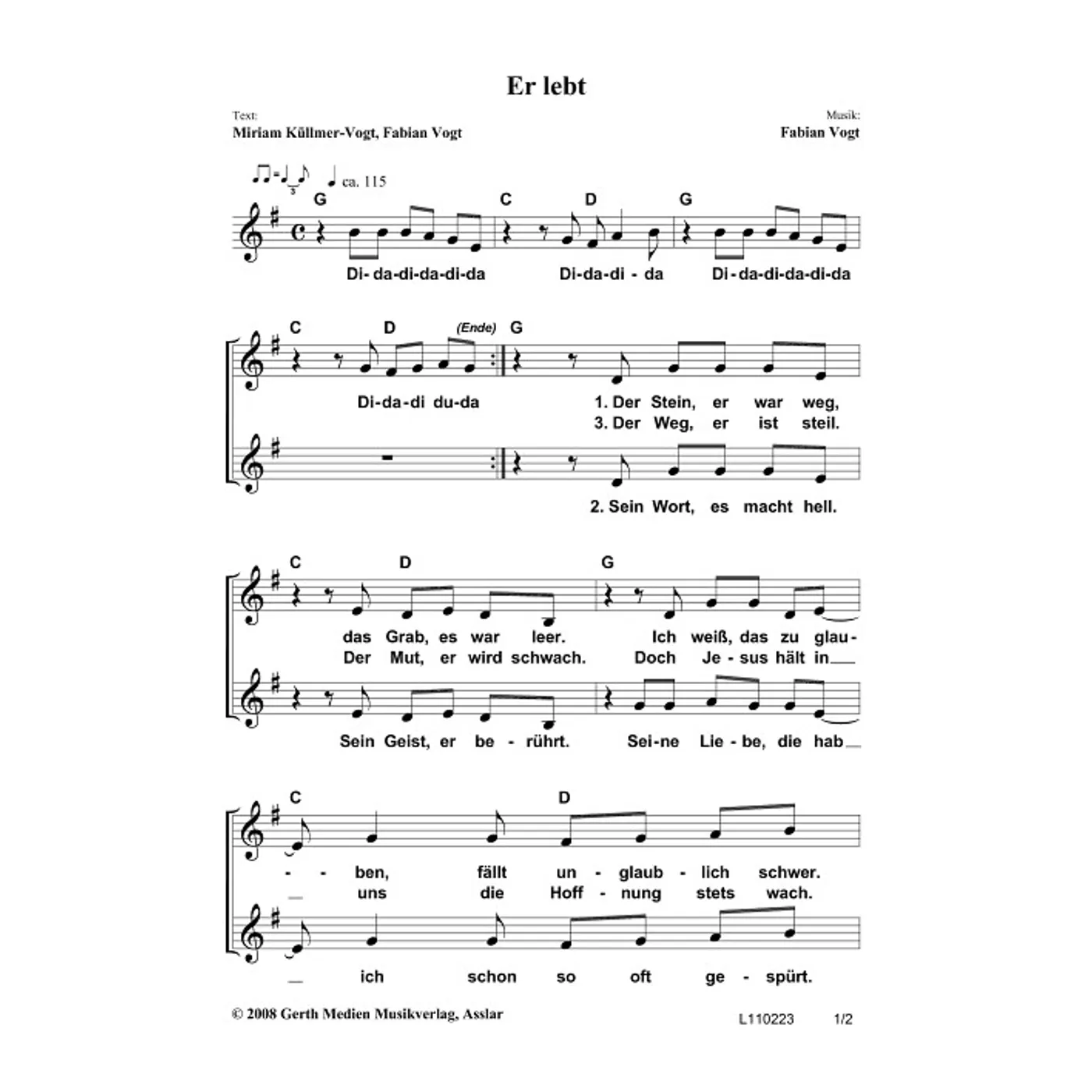 Er lebt (diese Variante haben Sie gerade ausgewählt) (modern, Kinderchor, mit Akkorden, zweistimmig, G-Dur) Miriam Küllmer-Vogt (Text), Fabian Vogt (Komposition, Text) |