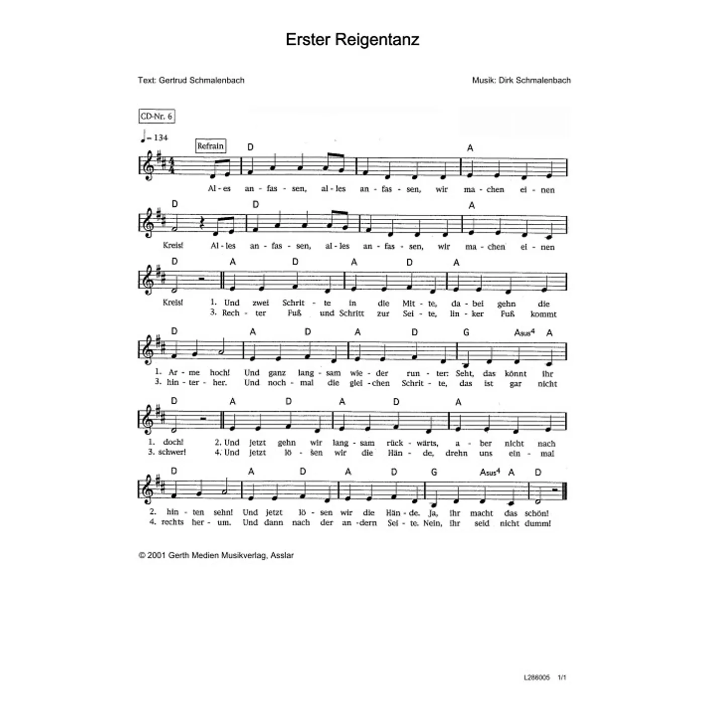 Erster Reigentanz (diese Variante haben Sie gerade ausgewählt) (einstimmig, mit Akkorden, D-Dur) Dirk Schmalenbach (Komposition), Gertrud Schmalenbach (Text) |
