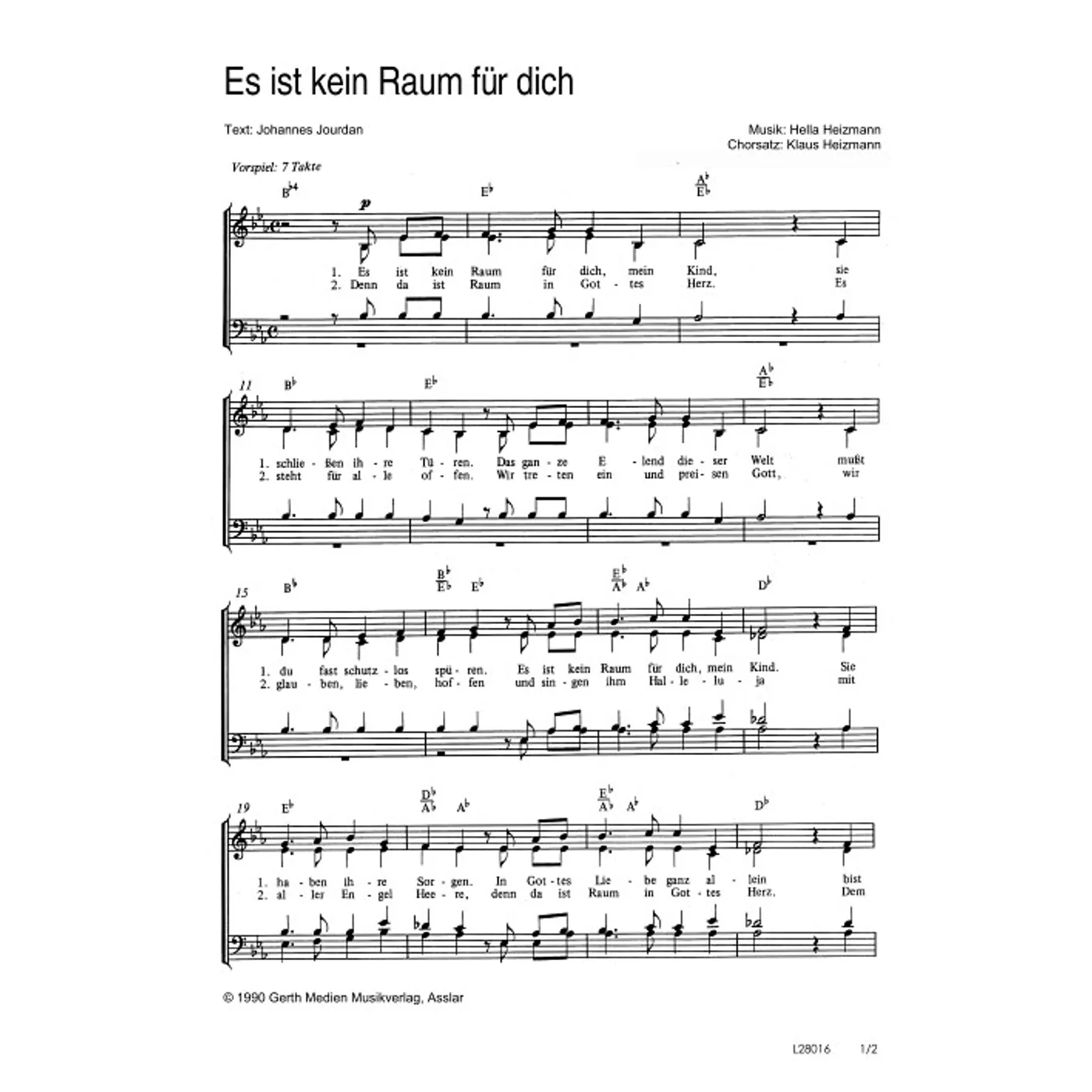 Dies ist ein Download-Artikel und kann nach dem Kauf digital heruntergeladen werden. Vorschau Hella Heizmann (Komposition) Johannes Jourdan (Text) Klaus Heizmann (Chorsatz) Es ist kein Raum für dich Gemischter Chor SATB (Noten - Download) Bitte beachten Sie: Downloads sind aktuell nur in Deutschland erhältlich. Bitte wählen Sie aus, für wie viele Kopien/Ausdrucke Sie eine Lizenz erwerben möchten. Die Lizenz wird entsprechend auf dem Dokument vermerkt. Noten - Download Weitere Varianten Alle Varianten anzeigen und vergleichen 1,50 € Sofort Lieferbar (per Download) Günstige Mengenpreise verfügbar Günstige Mengenpreise (DE) Kaufen Sie 2 zum Preis von je 1,43 € und sparen Sie 5% Kaufen Sie 10 zum Preis von je 1,35 € und sparen Sie 10% Kaufen Sie 25 zum Preis von je 1,28 € und sparen Sie 15% Kaufen Sie 50 zum Preis von je 1,20 € und sparen Sie 20% Kaufen Sie 100 zum Preis von je 1,13 € und sparen Sie 25% Lizenz pro Kopie/Ausdruck: Bestellen Sie den Artikel jetzt auf: Informationen zur Lizenz Details Reihe: Lieder zum Leben Verlag: Gerth Medien Artikel-Nr.: W80030870 Tonart: Es-Dur Stil/Genre: modern Satz: gemischter Chor, vierstimmig Seitenzahl: 2 S. Hinweise: DIN A4 Dateigröße insg.: 2,4 Megabyte Dieses Produkt ist preisgebunden: Ja Download-Material: L28016 (PDF) Angaben zum Hersteller nach GPSR: Gerth Medien i.d. SCM Verlagsgruppe GmbH Berliner Ring 62 35576 Wetzlar DEUTSCHLAND info@scm-verlagsgruppe.de Weitere Details Weitere Varianten Noten-Downloads Es ist kein Raum für dich (diese Variante haben Sie gerade ausgewählt) (modern, gemischter Chor, vierstimmig, Es-Dur) Hella Heizmann (Komposition), Johannes Jourdan (Text), Klaus Heizmann (Chorsatz) modern, gemischter Chor, vierstimmig, Es-Dur 1,50 € Es ist kein Raum für dich (Klavier, gemischter Chor, vierstimmig, Es-Dur, gleiche Reihe) Hella Heizmann (Komposition), Johannes Jourdan (Text), Klaus Heizmann (Bearbeiter) Klavier, gemischter Chor, vierstimmig, Es-Dur, gleiche Reihe 4,80 € Die Preise stellen die Einzelpreise der jeweils verfügbaren Einzeldownloads dar. Bewertungen Für dieses Produkt gibt es noch keine Rezensionen. Weitere Artikel von Hella Heizmann zur Produktseite von Jona - Singspiel - Liederheft Jona - Singspiel - Liederheft Liederbuch - Geheftet 7,99 € Lieferbar zur Produktseite von Das lebendige Buch (Arbeitsheft) Das lebendige Buch (Arbeitsheft) Noten - Download 7,50 € Download zur Produktseite von Die Schrift an der Wand (Arbeitsheft) Die Schrift an der Wand (Arbeitsheft) Noten - Download 7,50 € Download zur Produktseite von Die Reise nach Jerusalem (Liedtexte) Die Reise nach Jerusalem (Liedtexte) Noten - Download 3,80 € Download zur Produktseite von Die Reise nach Jerusalem - Liederheft Die Reise nach Jerusalem - Liederheft Noten - Download 7,50 € Download zur Produktseite von Echt elefantastisch Echt elefantastisch Audio - CD 15,00 € Lieferbar zur Produktseite von Die sonderbare Nacht (Klavierausgabe) Die sonderbare Nacht (Klavierausgabe) Noten - Download 14,80 € Download zur Produktseite von Die Reise nach Jerusalem - Partitur Die Reise nach Jerusalem - Partitur Noten - Download 15,00 € Download zur Produktseite von Die sonderbare Nacht (Liedtexte) Die sonderbare Nacht (Liedtexte) Noten - Download 3,80 € Min. Bestellmenge: 4 Download zur Produktseite von Die sonderbare Nacht (Orchesterpartitur/digital) * Die sonderbare Nacht (Orchesterpartitur/digital) * Noten - Download 19,80 € Download zur Produktseite von Echt Elefantastisch Echt Elefantastisch MP3-Album - Download 9,99 € Download zur Produktseite von So ist Gott, er hört Gebet So ist Gott, er hört Gebet Noten - Download 1,50 € Download Alle Artikel von Hella Heizmann anzeigen Das könnte Sie auch interessieren zur Produktseite von Es ist kein Raum für dich Es ist kein Raum für dich Noten - Download 12,50 € Download zur Produktseite von Es ist kein Raum für dich Es ist kein Raum für dich Noten - Download 1,50 € Download zur Produktseite von Es ist kein Raum für dich Es ist kein Raum für dich Noten - Download 1,50 € Download zur Produktseite von Es ist kein Raum für dich (Kontrabass) Es ist kein Raum für dich (Kontrabass) Noten - Download 2,80 € Download zur Produktseite von Es ist kein Raum für dich (Klarinette in B) Es ist kein Raum für dich (Klarinette in B) Noten - Download 2,80 € Download zur Produktseite von Es ist kein Raum für dich (Horn in F) Es ist kein Raum für dich (Horn in F) Noten - Download 2,80 € Download zur Produktseite von Es ist kein Raum für dich (Fagott) Es ist kein Raum für dich (Fagott) Noten - Download 2,80 € Download zur Produktseite von Es ist kein Raum für dich (Oboe) Es ist kein Raum für dich (Oboe) Noten - Download 2,80 € Download zur Produktseite von Es ist kein Raum für dich (Flöte) Es ist kein Raum für dich (Flöte) Noten - Download 2,80 € Download zur Produktseite von Es ist kein Raum für dich (Trompete in B) Es ist kein Raum für dich (Trompete in B) Noten - Download 2,80 € Download zur Produktseite von Es ist kein Raum für dich Es ist kein Raum für dich Noten - Download 1,50 € Download zur Produktseite von Es ist kein Raum für dich (Violoncello) Es ist kein Raum für dich (Violoncello) Noten - Download 2,80 € Download zur Produktseite von Es ist kein Raum für dich (Viola) Es ist kein Raum für dich (Viola) Noten - Download 2,80 € Download zur Produktseite von Es ist kein Raum für dich (Violine 2) Es ist kein Raum für dich (Violine 2) Noten - Download 2,80 € Download zur Produktseite von Es ist kein Raum für dich (Violine 1) Es ist kein Raum für dich (Violine 1) Noten - Download 2,80 € Download zur Produktseite von Es ist kein Raum für dich (Triangel) Es ist kein Raum für dich (Triangel) Noten - Download 2,80 € Download zur Produktseite von Es ist kein Raum für dich (Posaune) Es ist kein Raum für dich (Posaune) Noten - Download 2,80 € Download zur Produktseite von Es ist kein Raum für dich Es ist kein Raum für