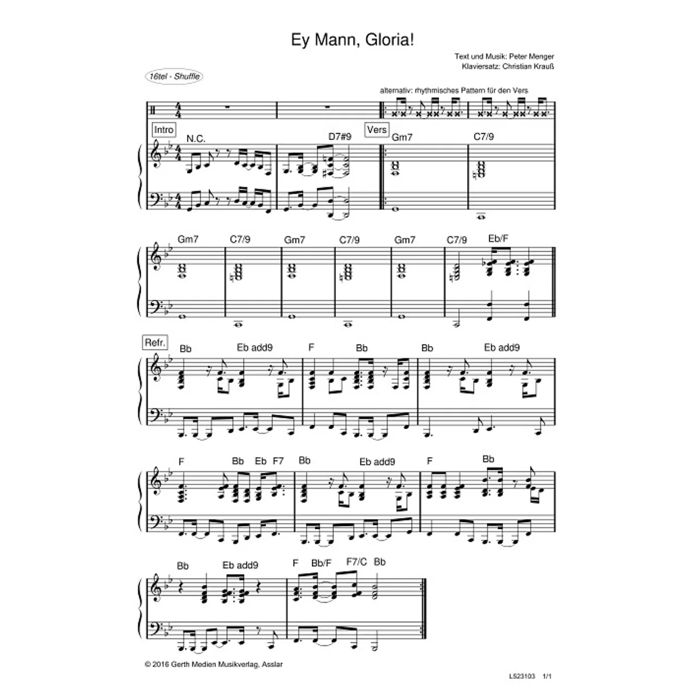 Ey Mann, Gloria (diese Variante haben Sie gerade ausgewählt) (Klavier, Klavierpartitur, Partituren, mit Akkorden, B-Dur) Peter Menger (Komposition, Text), Christian Krauß (Klaviersatz) |