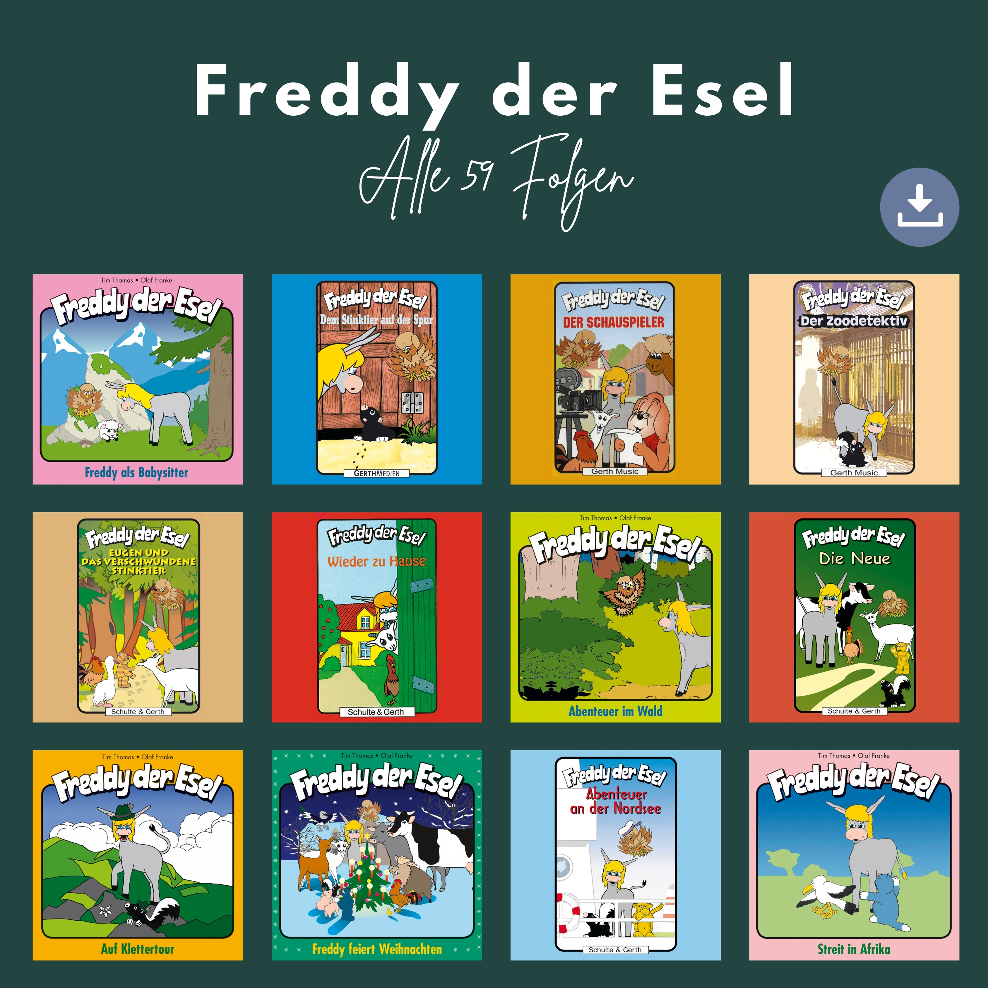Dies ist ein Download-Artikel und kann nach dem Kauf digital heruntergeladen werden. Tim Thomas (Prod.) Olaf Franke Freddy der Esel - alle 59 Folgen (MP3-Hörspiel - Download) Fans kennen und lieben ihn. Doch kennst Du schon den fröhlichsten Esel der Welt? Er heißt Freddy und wohnt bei Michael auf einem Bauernhof. Freddy kann zwar keine Milch geben wie die Kuh und keinen Honig produzieren wie die fleißigen Bienen, aber ein guter Freund sein, das kann er! Freddy der Esel – das sind über viele Jahre hinweg geschätzte und humorvolle Hörspiele. Alle 59 Folgen mit dem fröhlichen Langohr gibt es in diesem Sparpaket. Alle Hörspiele im mp3-Format zum Download. Bitte beachten Sie: Downloads sind aktuell nur in Deutschland erhältlich. 89,99 € 139,99 € Sofort Lieferbar (per Download) Bestellen Sie den Artikel jetzt auf: Details Reihe: Freddy der Esel Folge: 1-59 Erscheinungstermin: 27.09.2024 Verlag: Gerth Medien Artikel-Nr.: D96411700 EAN: 4029856741178 Sachgebiet: Hörspiele Altersempfehlung: ab 8 Jahre Spielzeit: 38 Stunden 16 Minuten 48 Sekunden Hinweise: 4029856741178.mp3 Dateigröße insg.: 4,3 Gigabyte Download-Material: Cover-Download Angaben zum Hersteller nach GPSR: Gerth Medien i.d. SCM Verlagsgruppe GmbH Berliner Ring 62 35576 Wetzlar DEUTSCHLAND info@scm-verlagsgruppe.de Weitere Details Bewertungen Für dieses Produkt gibt es noch keine Rezensionen. Weitere Artikel von Tim Thomas zur Produktseite von Mit Freddy durch die Bibel - alle 10 Folgen Mit Freddy durch die Bibel - alle 10 Folgen MP3-Hörspiel - Download 24,99 € 49,99 € Download zur Produktseite von Strawinsky - alle 6 Folgen Strawinsky - alle 6 Folgen MP3-Hörspiel - Download 19,99 € 29,99 € Download zur Produktseite von Eugen & Ede - alle 10 Folgen Eugen & Ede - alle 10 Folgen MP3-Hörspiel - Download 29,99 € 49,99 € Download zur Produktseite von Benny Blaufisch - alle 6 Folgen Benny Blaufisch - alle 6 Folgen MP3-Hörspiel - Download 19,99 € 35,94 € Download zur Produktseite von Juri und Janka - Die Bärenkinder - alle 9 Folgen Juri und Janka - Die Bärenkinder - alle 9 Folgen MP3-Hörspiel - Download 24,99 € 29,99 € Download zur Produktseite von Kasimir und Claudius - alle 5 Folgen Kasimir und Claudius - alle 5 Folgen MP3-Hörspiel - Download 14,99 € 24,95 € Download zur Produktseite von Balduin der Regenwurm - alle 8 Folgen Balduin der Regenwurm - alle 8 Folgen MP3-Hörspiel - Download 24,99 € 47,92 € Download zur Produktseite von Freddy der Esel - Folge 1 & 2 Freddy der Esel - Folge 1 & 2 Hörbuch/Hörspiel - Doppel-CD 9,99 € Lieferbar zur Produktseite von Emmis Lieblingslieder (Noten-Set) Emmis Lieblingslieder (Noten-Set) Noten - Download 9,50 € Download zur Produktseite von Er ist der Beste, den es gibt Er ist der Beste, den es gibt Noten - Download 1,50 € Download zur Produktseite von Freddy der Esel - Folge 1 Freddy der Esel - Folge 1 MP3-Hörspiel - Download 5,99 € Download zur Produktseite von Liebenswerte Originale Liebenswerte Originale Noten - Download 2,00 € Download Alle Artikel von Tim Thomas anzeigen Das könnte Sie auch interessieren zur Produktseite von Wildwest-Abenteuer - alle 24 Folgen Wildwest-Abenteuer - alle 24 Folgen MP3-Hörspiel - Download Die spannenden Hörspiele von Hanno Herzler entführen abenteuerlustige Kids in die aufregende ... 79,99 € 99,99 € Download zur Produktseite von Leonie - Abenteuer auf vier Hufen - alle 27 Folgen Leonie - Abenteuer auf vier Hufen - alle 27 Folgen MP3-Hörspiel - Download Leonie ist mit ihrer Familie aus Deutschland auf eine Ranch in die USA ... 79,99 € 99,99 € Download zur Produktseite von Dr. Brockers Weltraum-Abenteuer - alle 28 Folgen Dr. Brockers Weltraum-Abenteuer - alle 28 Folgen MP3-Hörspiel - Download Einfach galaktisch gut! In der beliebten Hörspiel-Serie von Hanno Herzler ... 79,99 € 99,99 € Download zur Produktseite von Schlaumeier - alle 8 Folgen Schlaumeier - alle 8 Folgen MP3-Hörspiel - Download Eine drollige Hörspielserie von Lisa Fuchs. Der aufgeweckte Fuchs Schlaumeier lebt mit dem ... 19,99 € 39,99 € Download
