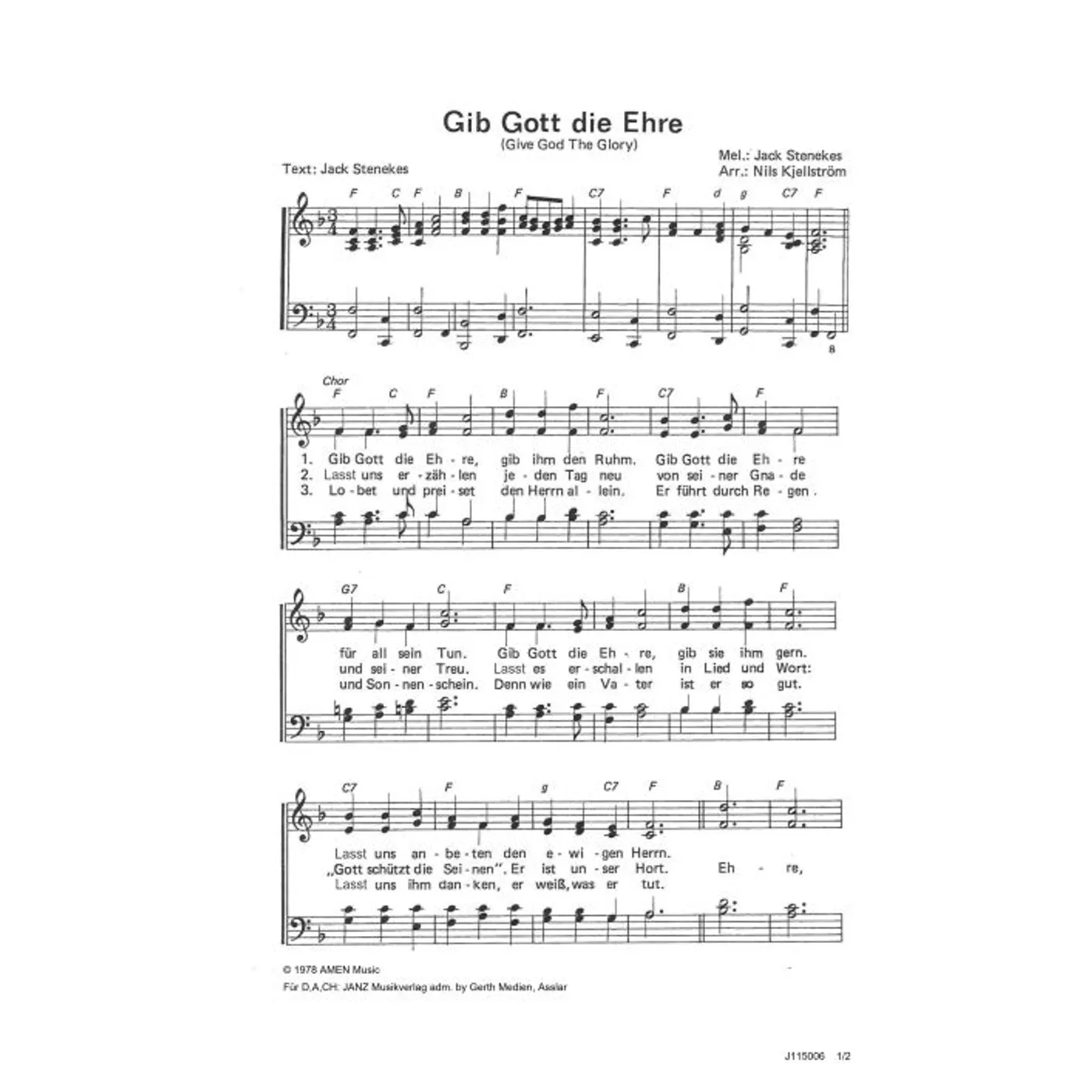 Gib Gott die Ehre (diese Variante haben Sie gerade ausgewählt) (Gemeindelied, traditionell, gemischter Chor, mit Akkorden, vierstimmig, F-Dur) Nils Kjellström (Chorsatz), Jack Stenekes (Komposition, Text) |