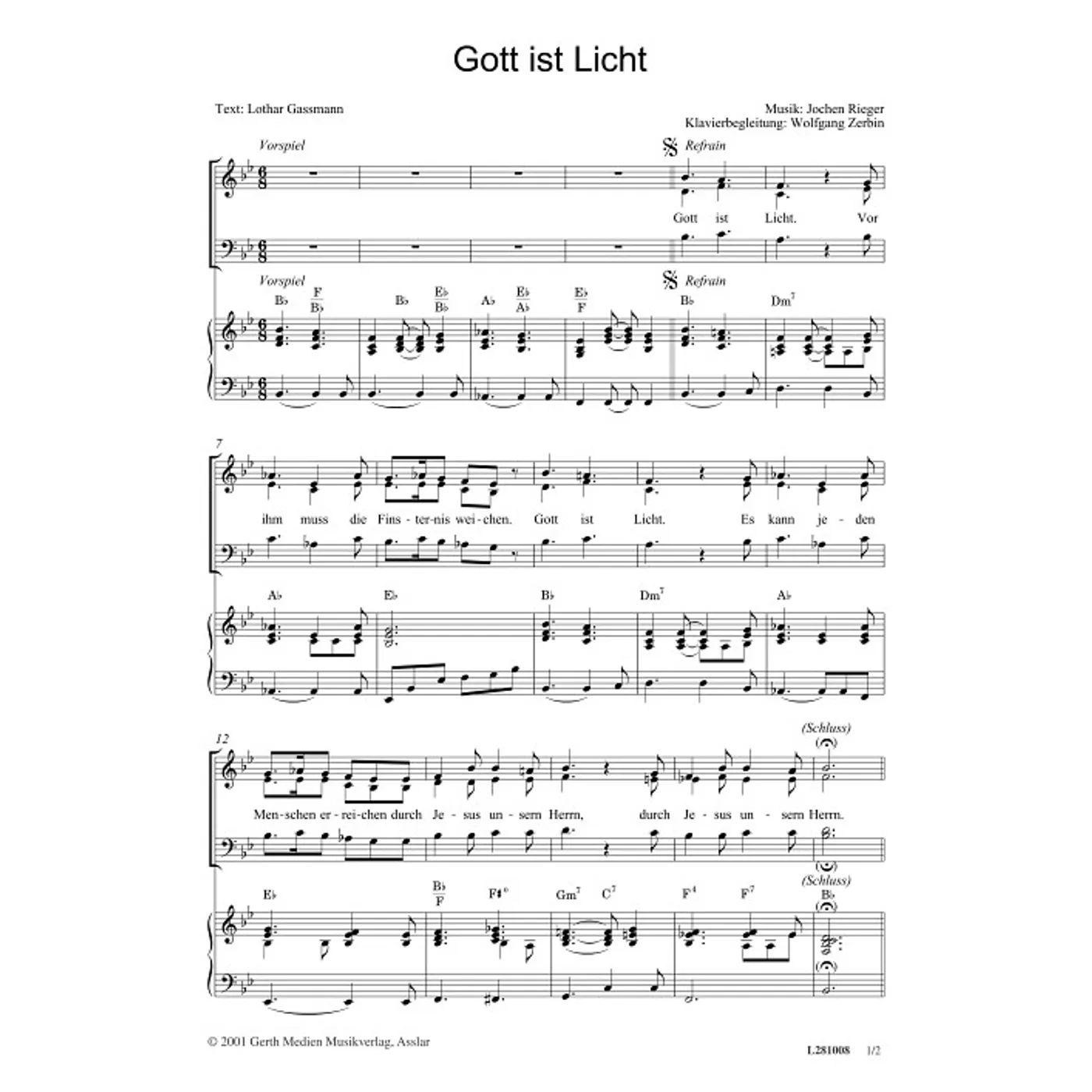 Gott ist Licht (modern, dreistimmig, gemischter Chor, mit Akkorden, B-Dur) Jochen Rieger (Komposition), Lothar Gassmann (Text) | modern, dreistimmig, gemischter Chor, mit Akkorden, B-Dur | 1,50 € |