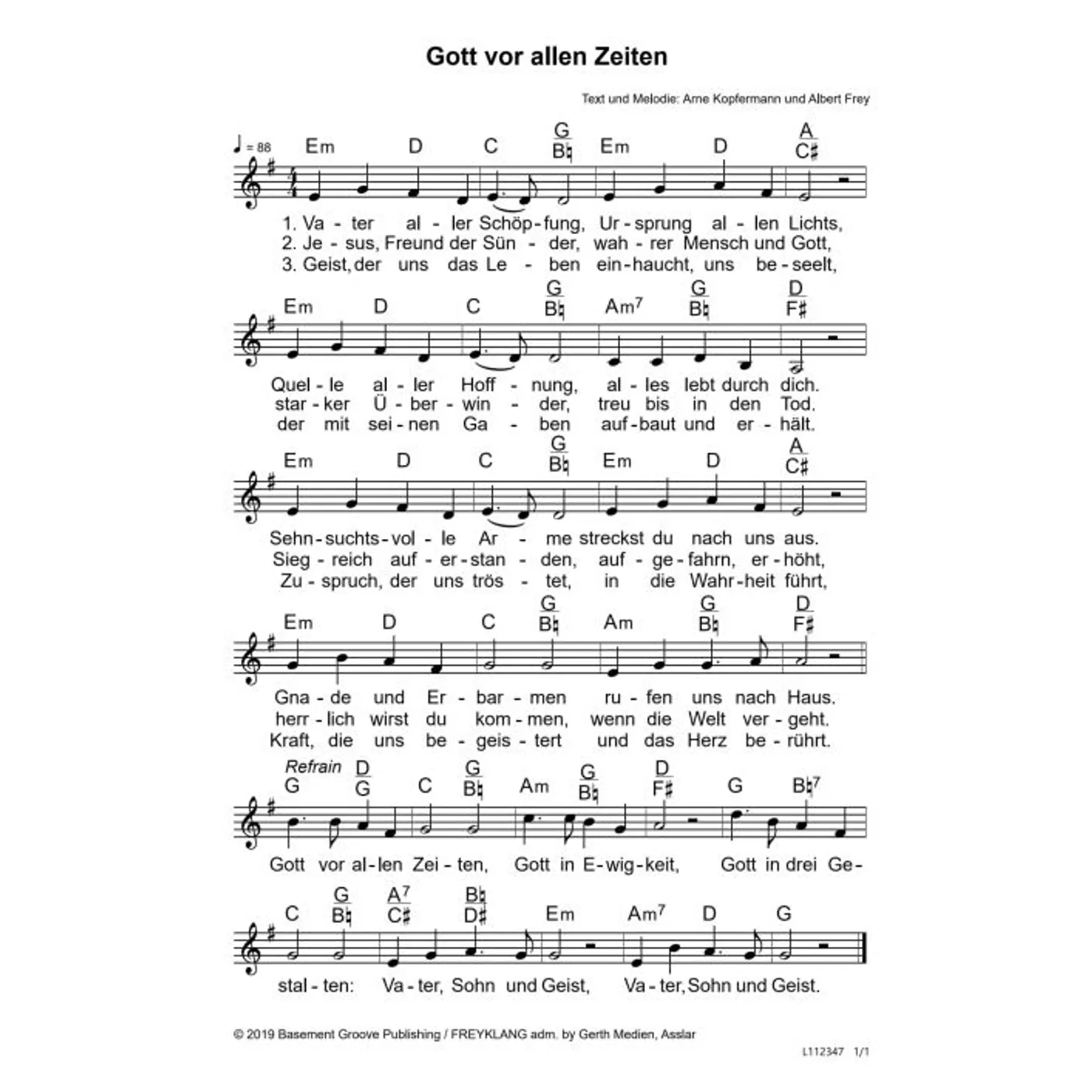 Gott vor allen Zeiten (diese Variante haben Sie gerade ausgewählt) (modern, mit Akkorden, E-Moll) Albert Frey (Komposition, Text), Arne Kopfermann (Komposition, Text) |