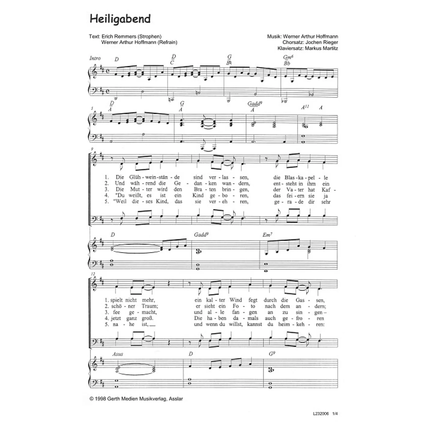 Heiligabend (diese Variante haben Sie gerade ausgewählt) (Klavier, gemischter Chor, mit Akkorden, vierstimmig, D-Dur) Werner A. Hoffmann (Komposition, Text), Erich Remmers (Text), Jochen Rieger (Chorsatz), Markus Martitz (Klaviersatz) |