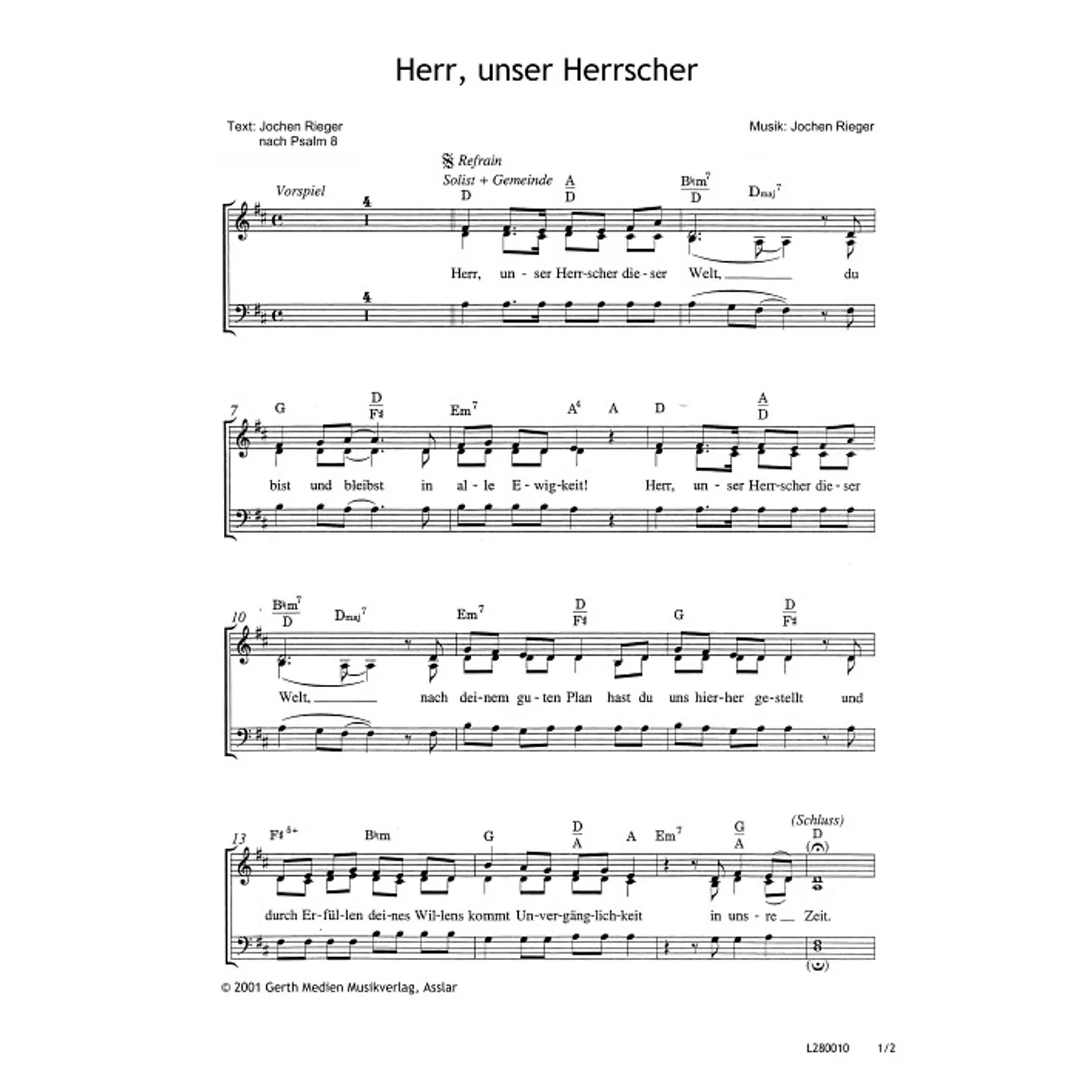 Herr, unser Herrscher (modern, Klavier, Solostimme, dreistimmig, gemischter Chor, mit Akkorden, D-Dur) Jochen Rieger (Komposition, Text), Wolfgang Zerbin (Bearbeiter) | modern, Klavier, Solostimme, dreistimmig, gemischter Chor, mit Akkorden, D-Dur | 3,80 € |