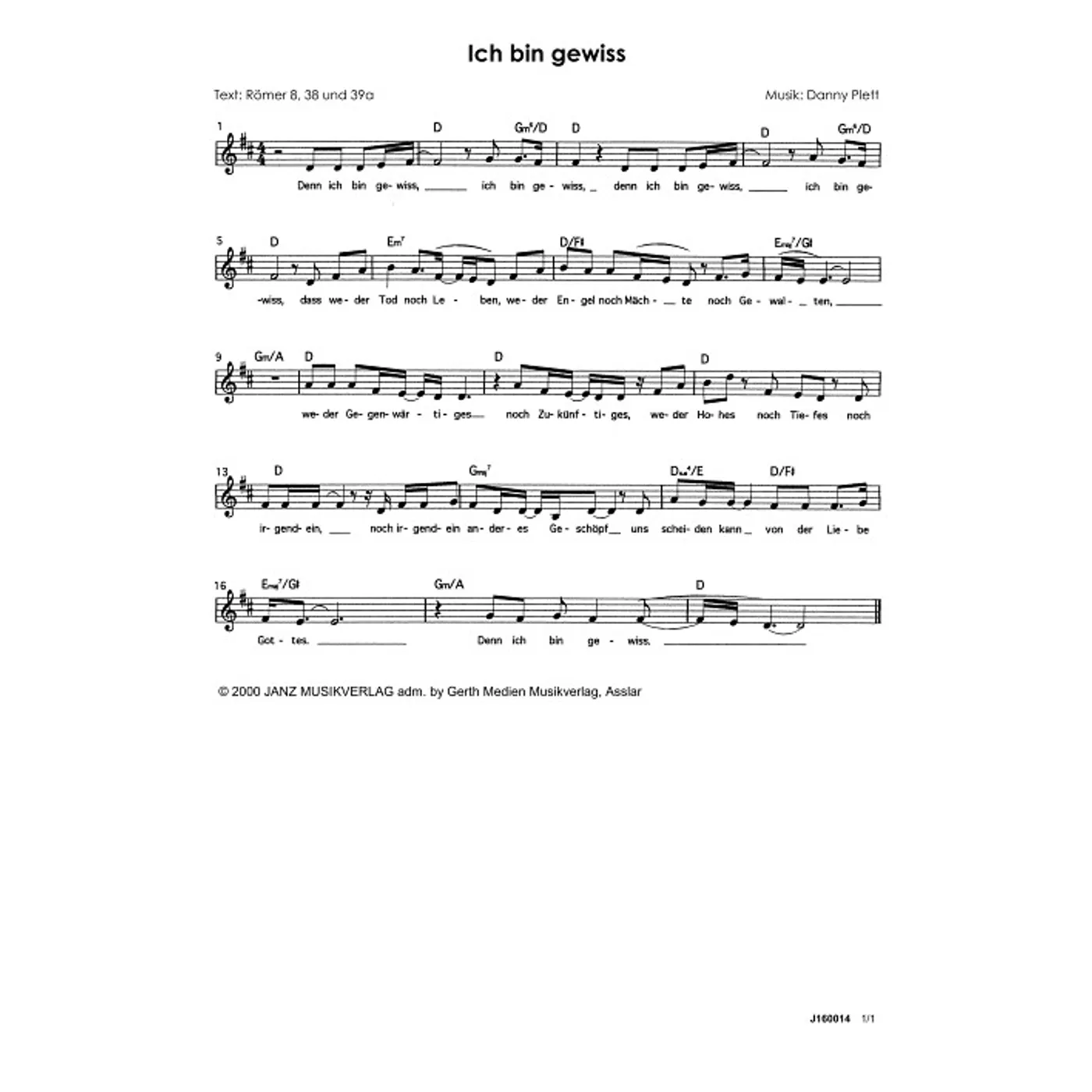Ich bin gewiss (diese Variante haben Sie gerade ausgewählt) (einstimmig, mit Akkorden, D-Dur) Danny Plett (Komposition) |