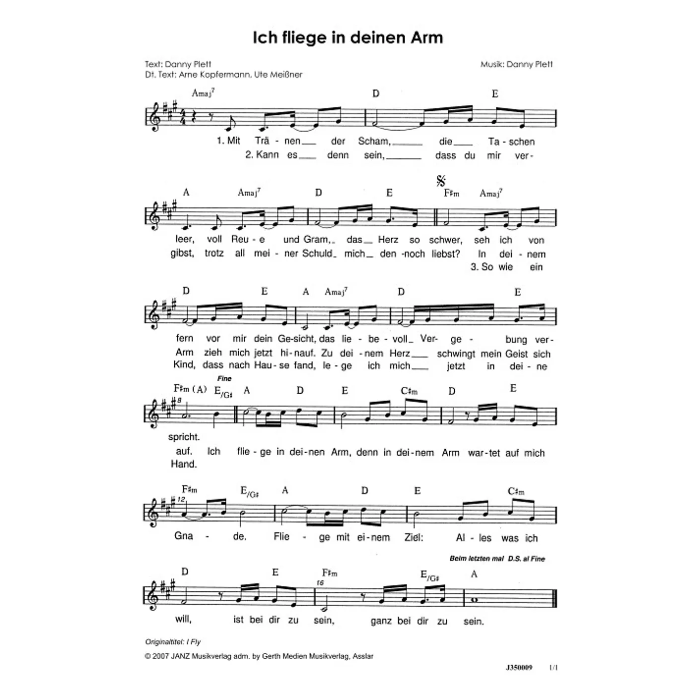 Ich fliege in deinen Arm (diese Variante haben Sie gerade ausgewählt) (einstimmig, mit Akkorden, A-Dur) Danny Plett (Komposition, Text), Arne Kopfermann (Übersetzung), Ute Meißner (Übersetzung) |