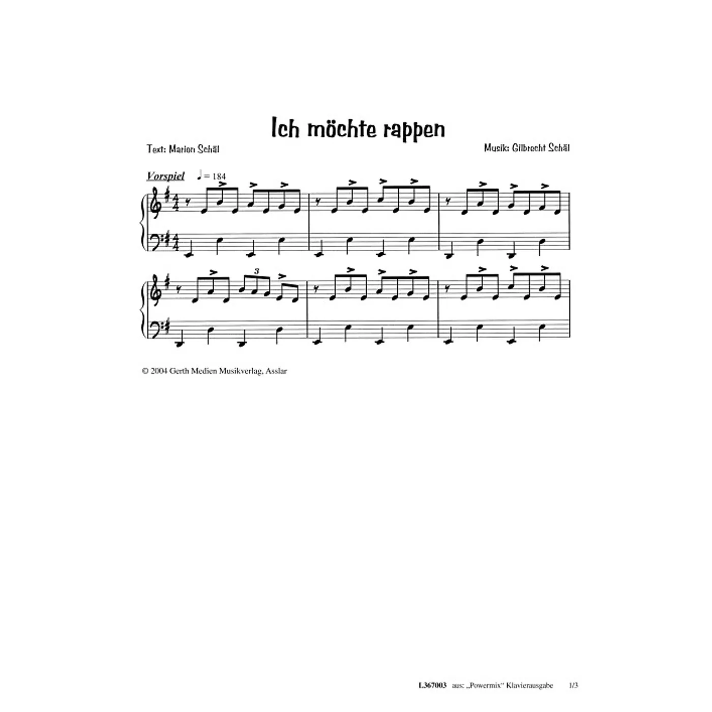 Ich möchte rappen (Kinderchor, dreistimmig, mit Akkorden, C-Dur) Gilbrecht Schäl (Komposition), Marion Schäl (Text) | Kinderchor, dreistimmig, mit Akkorden, C-Dur | 1,50 € |