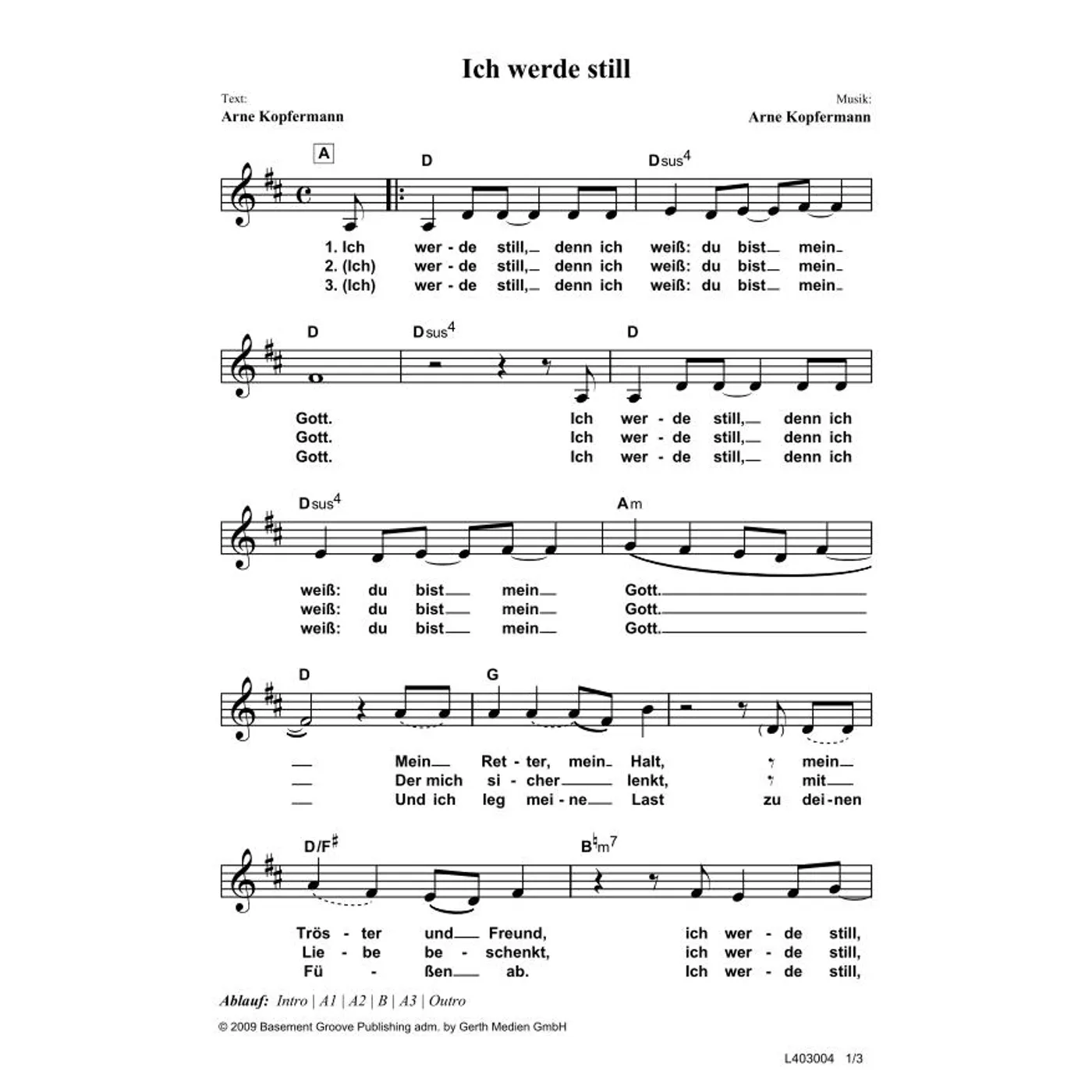 Ich werde still (diese Variante haben Sie gerade ausgewählt) (einstimmig, mit Akkorden, D-Dur) Arne Kopfermann (Komposition, Text) |