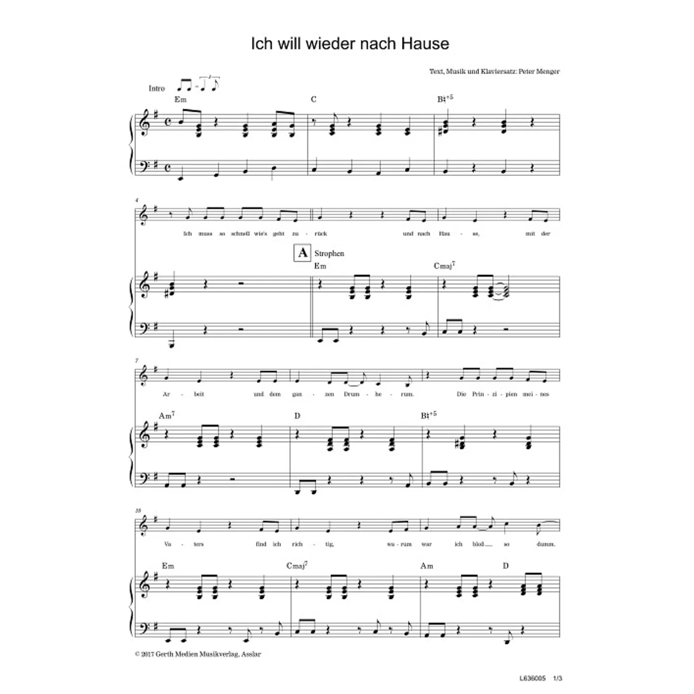 Ich will wieder nach Hause (einstimmig, mit Akkorden, E-Moll, gleiche Reihe) Peter Menger (Komposition, Text) | einstimmig, mit Akkorden, E-Moll, gleiche Reihe | 1,50 € |