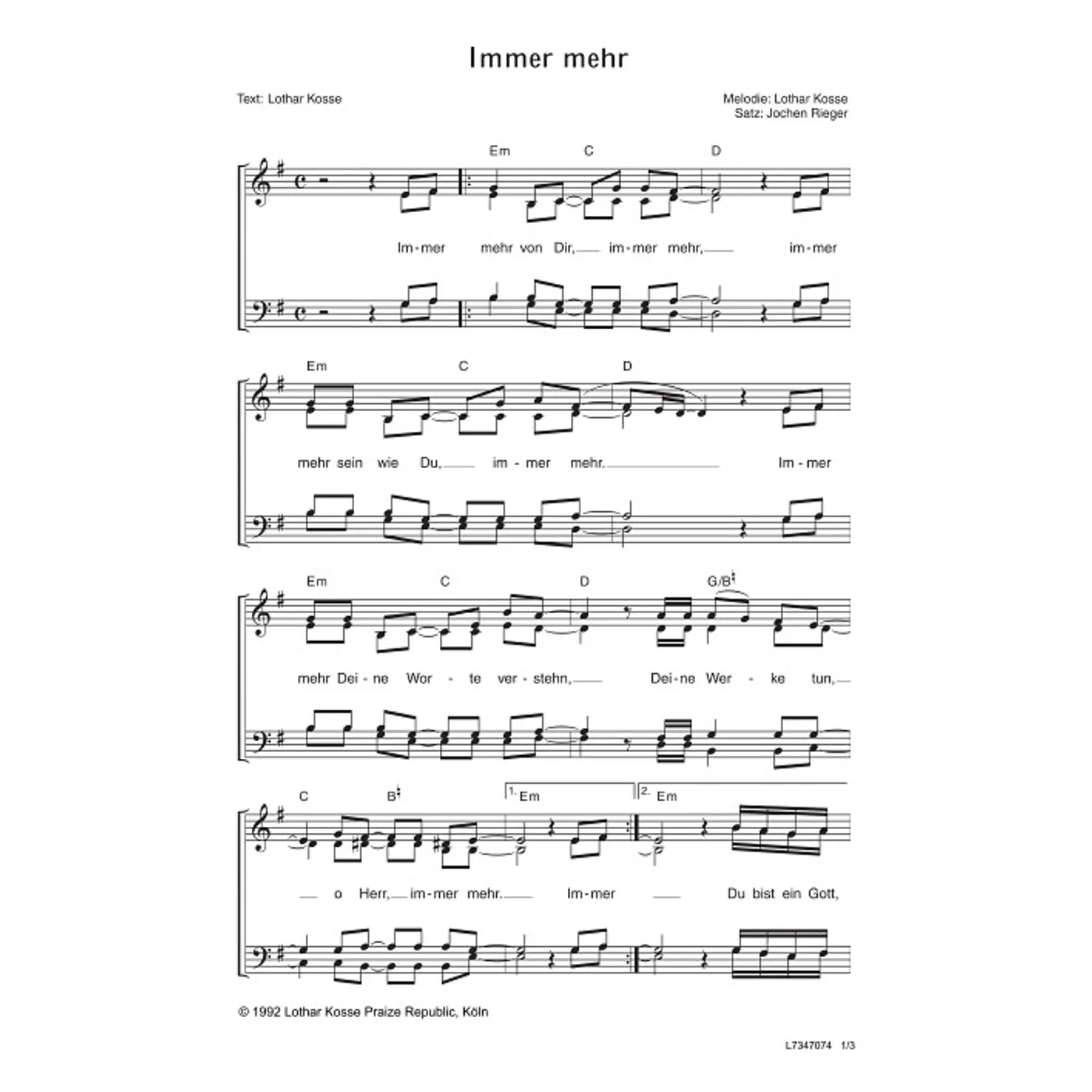 Dies ist ein Download-Artikel und kann nach dem Kauf digital heruntergeladen werden. Vorschau Lothar Kosse (Komposition, Text) Michael Schlierf (Chorsatz) Immer mehr Gemischter Chor SATB (Noten - Download) Bitte beachten Sie: Downloads sind aktuell nur in Deutschland erhältlich. Bitte wählen Sie aus, für wie viele Kopien/Ausdrucke Sie eine Lizenz erwerben möchten. Die Lizenz wird entsprechend auf dem Dokument vermerkt. 2,00 € Sofort Lieferbar (per Download) Günstige Mengenpreise verfügbar Günstige Mengenpreise (DE) Kaufen Sie 2 zum Preis von je 1,90 € und sparen Sie 5% Kaufen Sie 10 zum Preis von je 1,80 € und sparen Sie 10% Kaufen Sie 25 zum Preis von je 1,70 € und sparen Sie 15% Kaufen Sie 50 zum Preis von je 1,60 € und sparen Sie 20% Kaufen Sie 100 zum Preis von je 1,50 € und sparen Sie 25% Lizenz pro Kopie/Ausdruck: Bestellen Sie den Artikel jetzt auf: Informationen zur Lizenz Details Verlag: Gerth Medien Artikel-Nr.: W80035255 Tonart: E-Moll Stil/Genre: modern Satz: gemischter Chor, mit Akkorden, vierstimmig Seitenzahl: 3 S. Hinweise: DIN A4 Dateigröße insg.: 178,2 Kilobyte Dieses Produkt ist preisgebunden: Ja Download-Material: L7347074 (PDF) Angaben zum Hersteller nach GPSR: Gerth Medien i.d. SCM Verlagsgruppe GmbH Berliner Ring 62 35576 Wetzlar DEUTSCHLAND info@scm-verlagsgruppe.de Weitere Details Weitere Varianten Noten-Downloads Immer mehr (diese Variante haben Sie gerade ausgewählt) (modern, gemischter Chor, mit Akkorden, vierstimmig, E-Moll) Lothar Kosse (Komposition, Text), Michael Schlierf (Chorsatz) modern, gemischter Chor, mit Akkorden, vierstimmig, E-Moll 2,00 € Die Preise stellen die Einzelpreise der jeweils verfügbaren Einzeldownloads dar. Bewertungen Für dieses Produkt gibt es noch keine Rezensionen. Weitere Artikel von Lothar Kosse zur Produktseite von Durch deine Wunden Durch deine Wunden Noten - Download 1,50 € Download zur Produktseite von Passion und Ostern - Noten für Chöre Passion und Ostern - Noten für Chöre Noten - Download 9,50 € Download zur Produktseite von Ich weiß, dass mein Erlöser lebt Ich weiß, dass mein Erlöser lebt Noten - Download 2,00 € Download zur Produktseite von Home Sessions (Noten-Set) Home Sessions (Noten-Set) Noten - Download 7,50 € Download zur Produktseite von Hefe (Playback ohne Backings) Hefe (Playback ohne Backings) MP3-Album - Download 2,99 € Download zur Produktseite von Ich weiß, dass mein Erlöser lebt Ich weiß, dass mein Erlöser lebt Noten - Download 3,80 € Download zur Produktseite von Ich weiß, dass mein Erlöser lebt Ich weiß, dass mein Erlöser lebt Noten - Download 1,50 € Download zur Produktseite von Wunderbarer Hirt Wunderbarer Hirt Noten - Download 1,50 € Download zur Produktseite von Wir sind hier um anzubeten Wir sind hier um anzubeten Noten - Download 1,50 € Download zur Produktseite von Näher zu dir Näher zu dir Noten - Download 2,50 € Download zur Produktseite von Wunderbarer Hirt Wunderbarer Hirt Noten - Download 1,50 € Download zur Produktseite von Wunderbarer Hirt Wunderbarer Hirt Noten - Download 4,80 € Download Alle Artikel von Lothar Kosse anzeigen Das könnte Sie auch interessieren zur Produktseite von Wunderbarer Hirt Wunderbarer Hirt Noten - Download 2,80 € Download zur Produktseite von Du, o Herr, bist allmächtig Du, o Herr, bist allmächtig Noten - Download 1,50 € Download zur Produktseite von Du, o Herr, bist allmächtig Du, o Herr, bist allmächtig Noten - Download 1,50 € Download zur Produktseite von Der Strom Gottes fließt Der Strom Gottes fließt Noten - Download 1,50 € Download zur Produktseite von Es gibt noch mehr Es gibt noch mehr Noten - Download 1,50 € Download zur Produktseite von Der Strom Gottes fließt Der Strom Gottes fließt Noten - Download 2,00 € Download zur Produktseite von Wind Gottes Wind Gottes Noten - Download 2,00 € Download