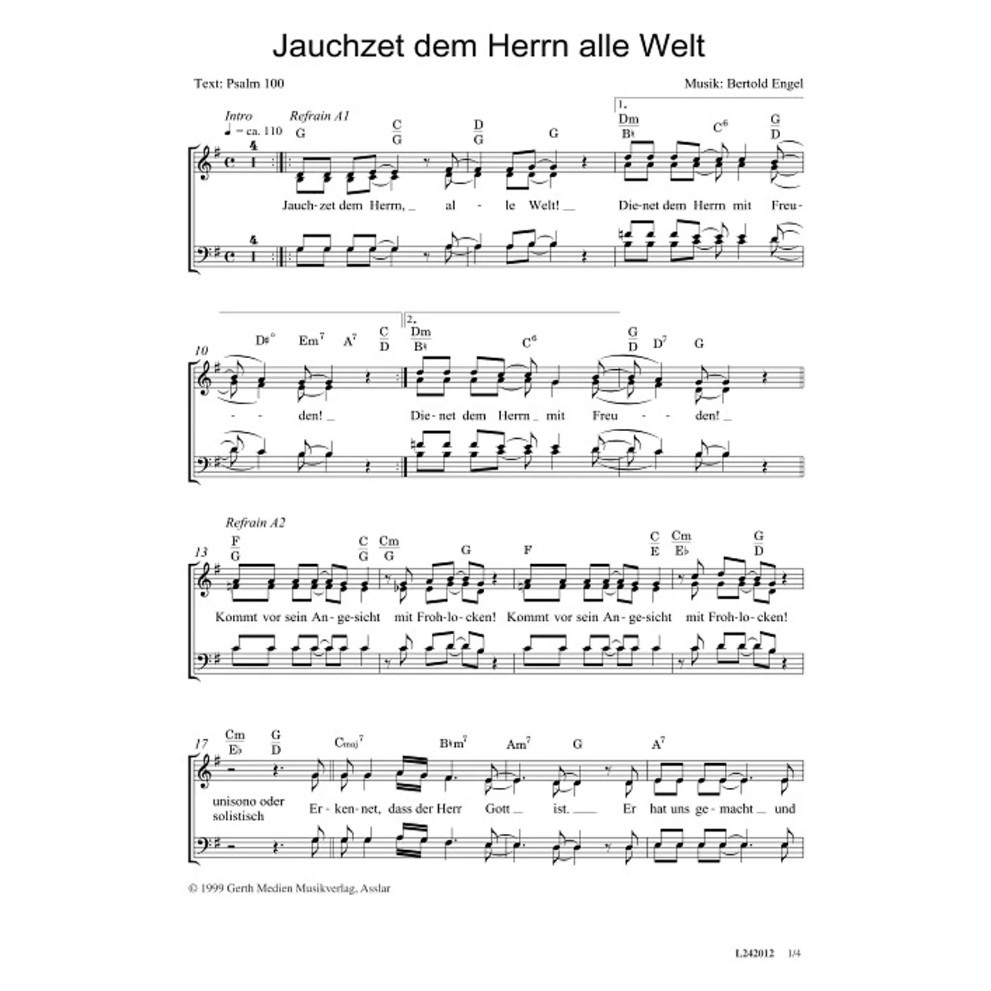 Jauchzet dem Herrn alle Welt (modern, Klavier, Solostimme, gemischter Chor, mit Akkorden, vierstimmig, G-Dur) Bertold Engel (Klaviersatz) | modern, Klavier, Solostimme, gemischter Chor, mit Akkorden, vierstimmig, G-Dur | 4,80 € |
