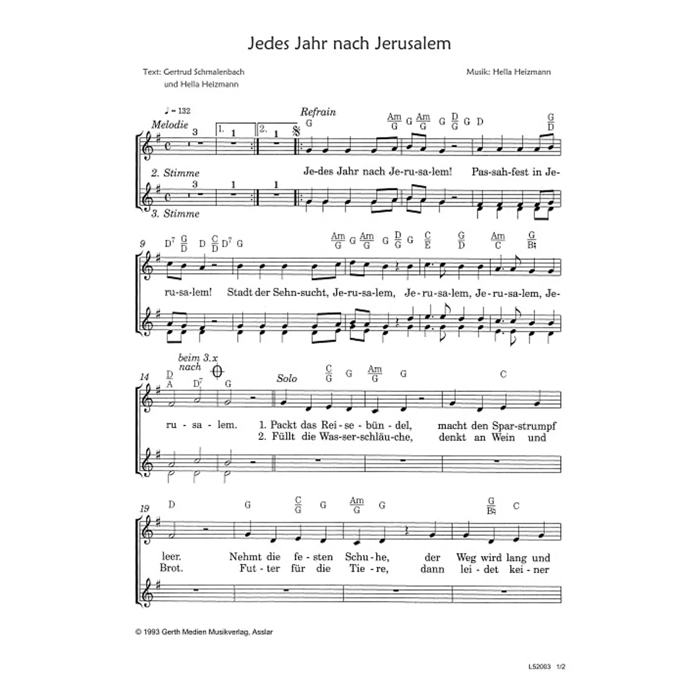 Jedes Jahr nach Jerusalem (diese Variante haben Sie gerade ausgewählt) (Kinderchor, dreistimmig, mit Akkorden, G-Dur) Gertrud Schmalenbach (Text), Hella Heizmann (Komposition, Text) |