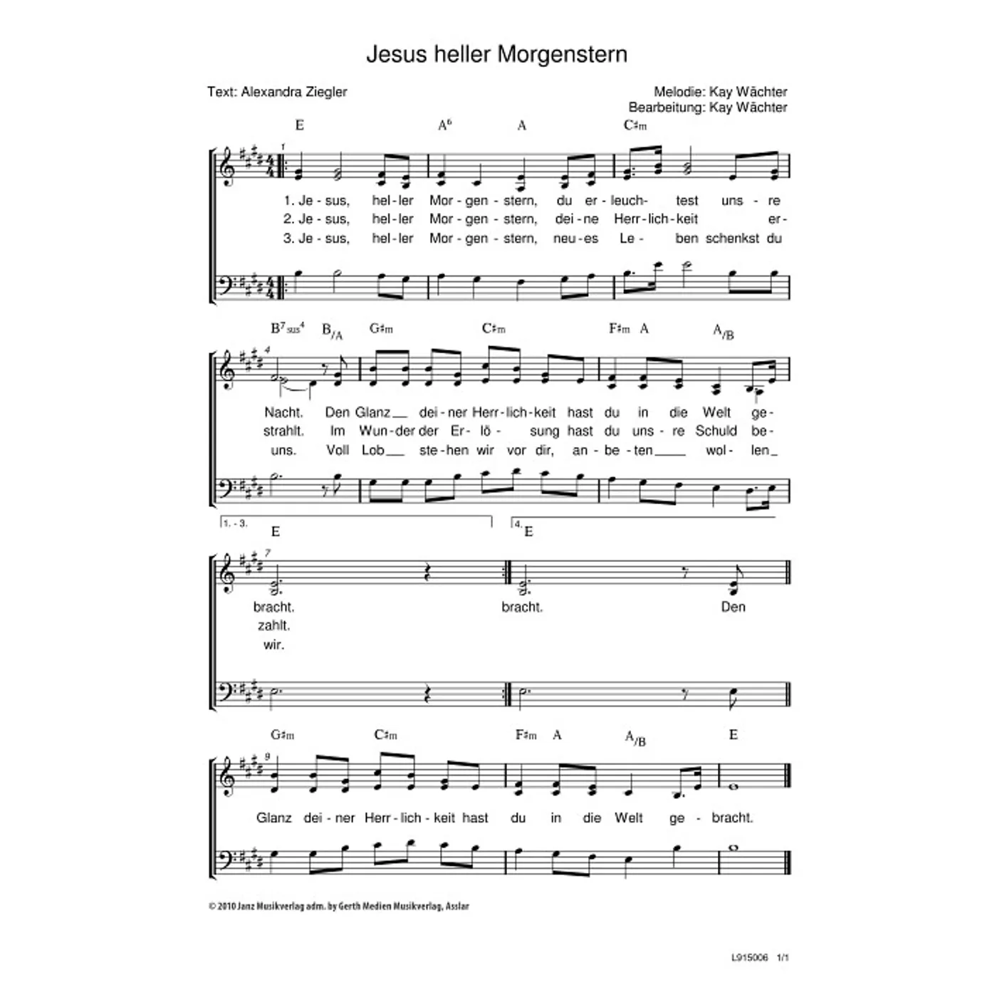 Jesus, heller Morgenstern (diese Variante haben Sie gerade ausgewählt) (modern, dreistimmig, gemischter Chor, mit Akkorden, E-Dur) Alexandra Ziegler (Text), Kay Wächter (Komposition, Bearbeiter) |
