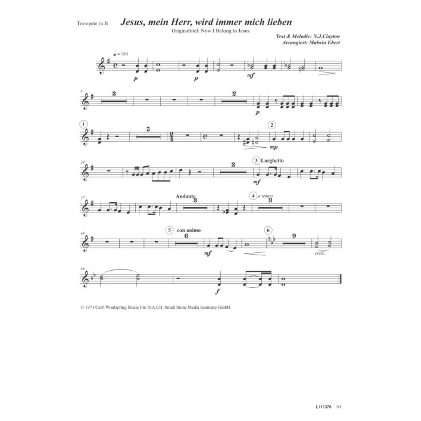 Jesus, mein Herr, wird immer mich lieben (Trompete in B) (diese Variante haben Sie gerade ausgewählt) (traditionell, Orchestereinzelstimme) Norman J. Clayton (Komposition, Text), Malwin Ebert (Bearbeiter), Anton Schulte (Übersetzung) |