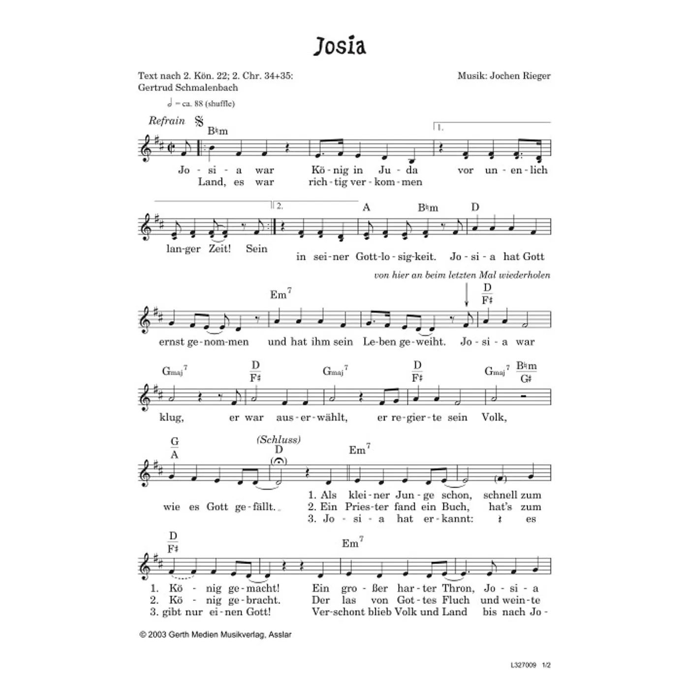 Josia (diese Variante haben Sie gerade ausgewählt) (einstimmig, mit Akkorden, h-Moll) Jochen Rieger (Komposition), Gertrud Schmalenbach (Text) |