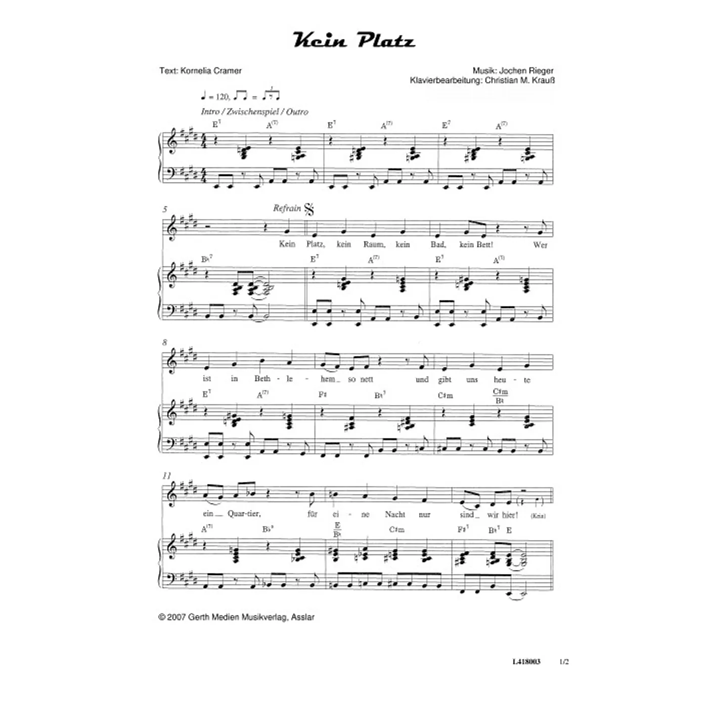 Kein Platz (diese Variante haben Sie gerade ausgewählt) (Klavier, einstimmig, mit Akkorden, E-Dur) Jochen Rieger (Komposition), Konny Cramer (Text), Christian Krauß (Bearbeiter) |