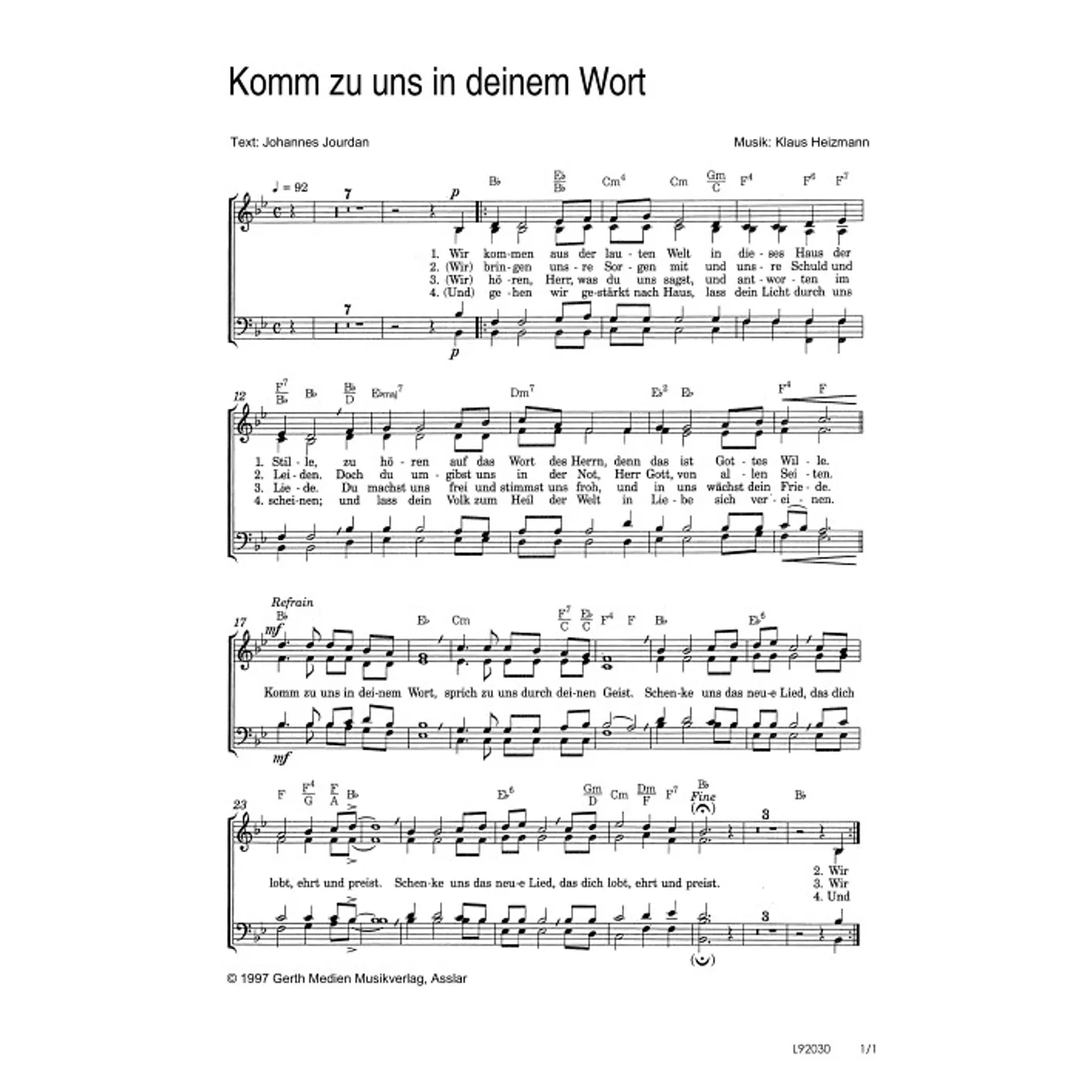 Komm zu uns in deinem Wort (diese Variante haben Sie gerade ausgewählt) (traditionell, gemischter Chor, mit Akkorden, vierstimmig, B-Dur) Johannes Jourdan (Text), Klaus Heizmann (Komposition) |
