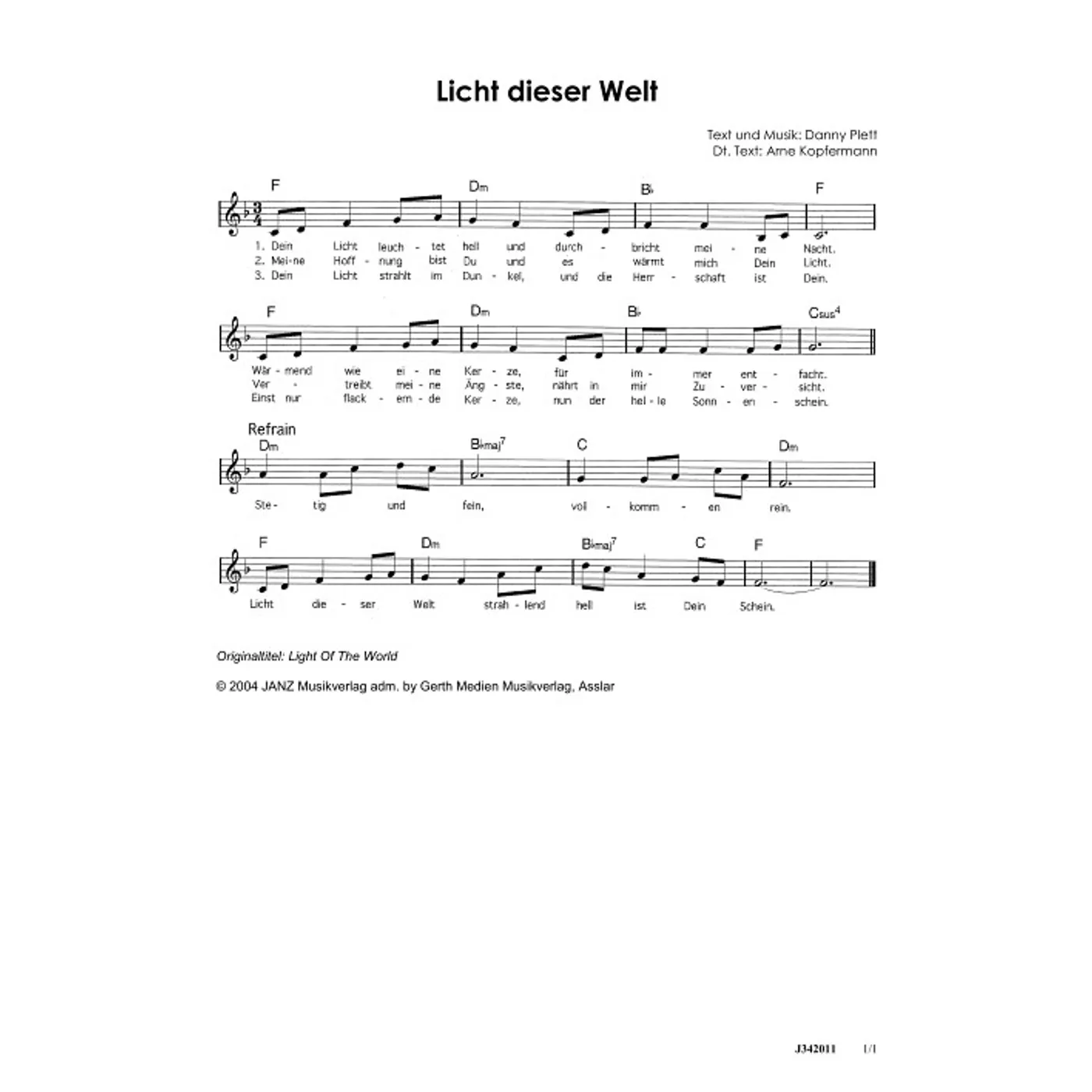 Licht dieser Welt (diese Variante haben Sie gerade ausgewählt) (einstimmig, mit Akkorden, F-Dur) Danny Plett (Komposition, Text), Arne Kopfermann (Übersetzung) |
