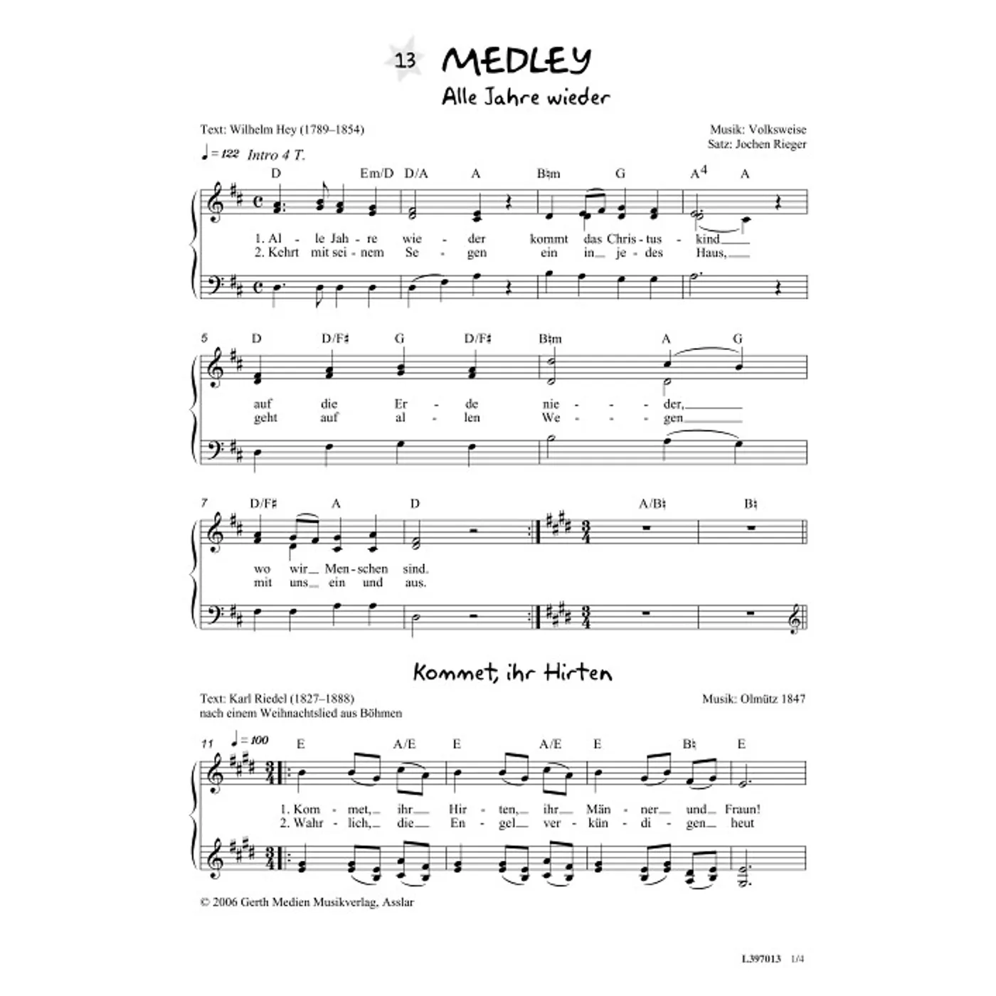 MEDLEY Alle Jahre wieder / Kommet, ihr Hirten / Mit den Hirten / Macht hoch die (diese Variante haben Sie gerade ausgewählt) (dreistimmig, mit Akkorden, D-Dur) Jochen Rieger (Bearbeiter) |