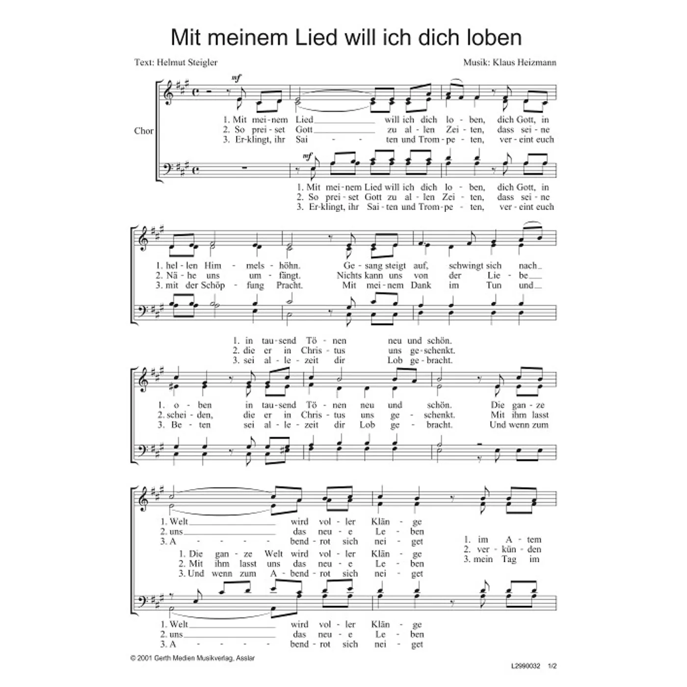 Mit meinem Lied will ich dich loben (diese Variante haben Sie gerade ausgewählt) (Kantate, traditionell, gemischter Chor, vierstimmig) Klaus Heizmann (Komposition, Chorsatz), Helmut Steigler (Text) |