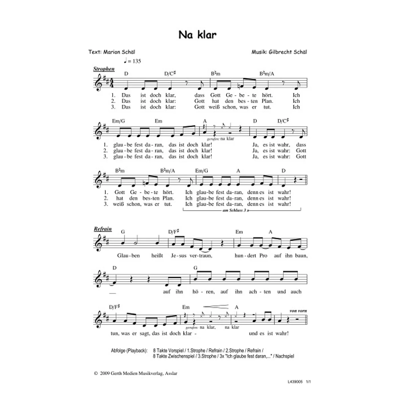 Na klar (diese Variante haben Sie gerade ausgewählt) (einstimmig, mit Akkorden, D-Dur) Gilbrecht Schäl (Komposition), Marion Schäl (Text) |