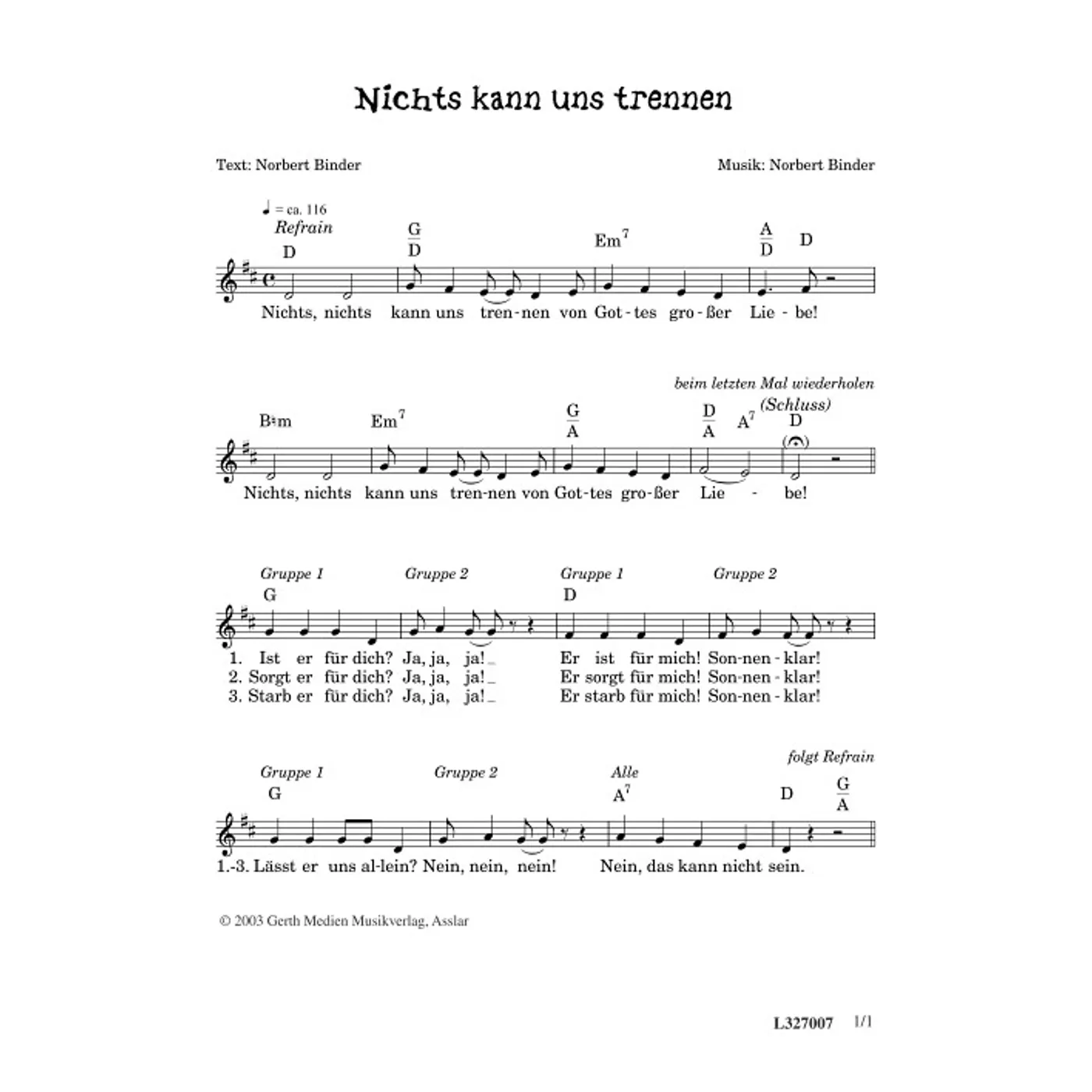 Nichts kann uns trennen (diese Variante haben Sie gerade ausgewählt) (einstimmig, mit Akkorden, D-Dur) Norbert Binder (Komposition, Text) |