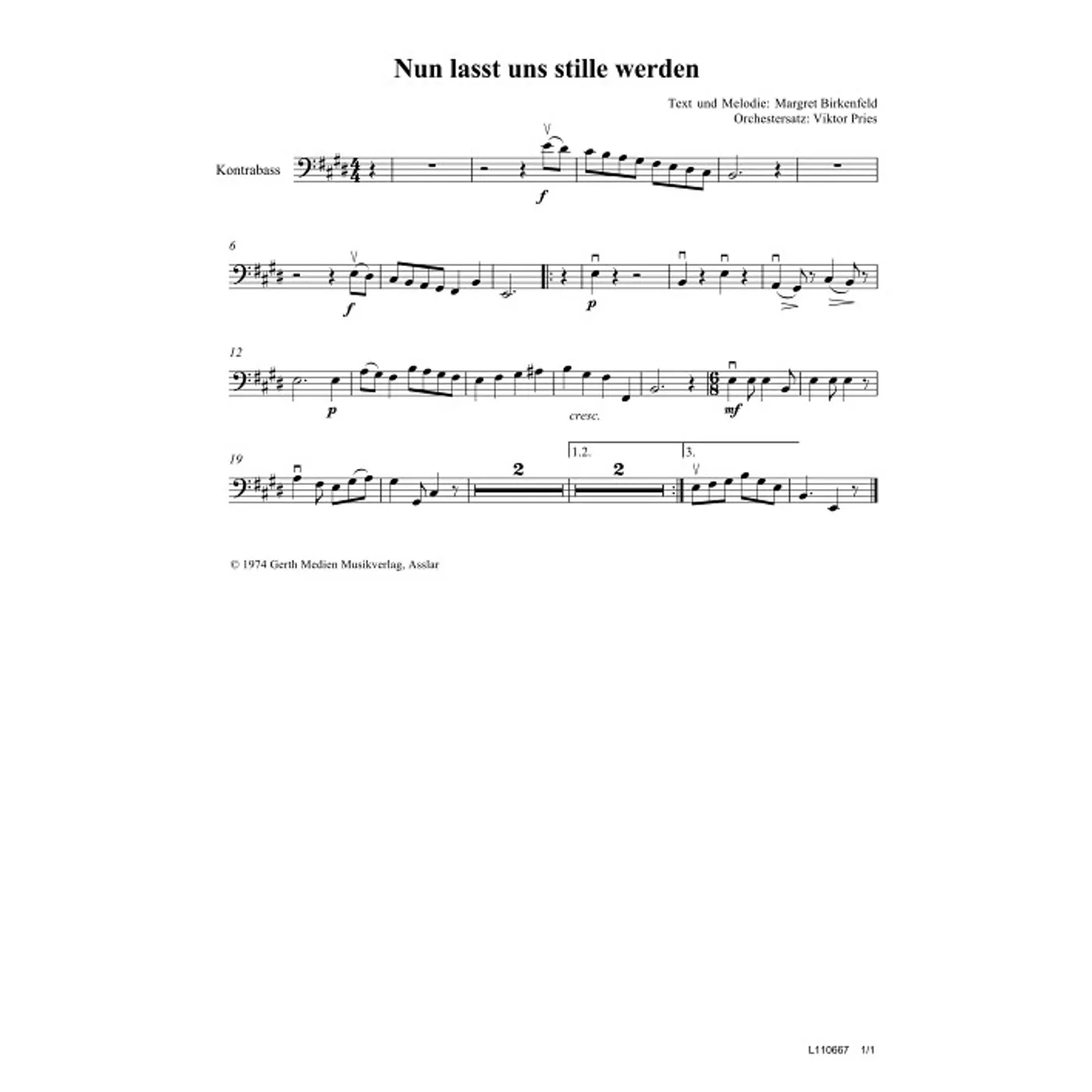 Nun lasst uns stille werden (Kontrabass) (diese Variante haben Sie gerade ausgewählt) (traditionell, Orchestereinzelstimme) Margret Birkenfeld (Komposition, Text), Viktor Pries (Bearbeiter, Bearbeitung) |