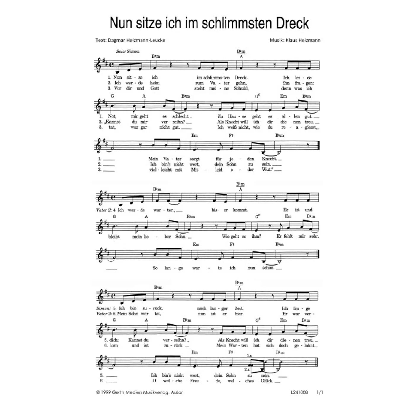 Nun sitze ich im schlimmsten Dreck (diese Variante haben Sie gerade ausgewählt) (modern, Kinderchor, Solostimme, einstimmig, mit Akkorden, h-Moll) Klaus Heizmann (Komposition), Dagmar Heizmann-Leucke (Text) |