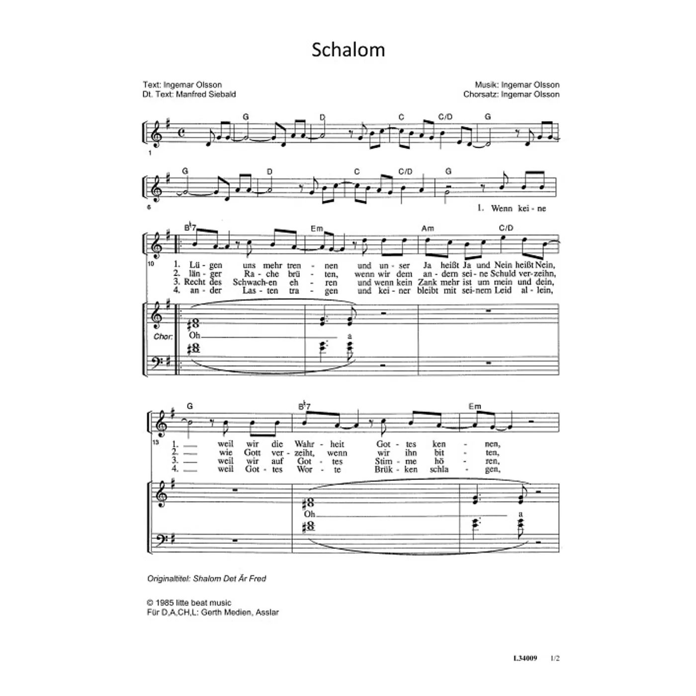 Schalom (diese Variante haben Sie gerade ausgewählt) (modern, gemischter Chor, mit Akkorden, vierstimmig, G-Dur) Ingemar Olsson (Komposition, Text, Chorsatz), Manfred Siebald (Übersetzung) |