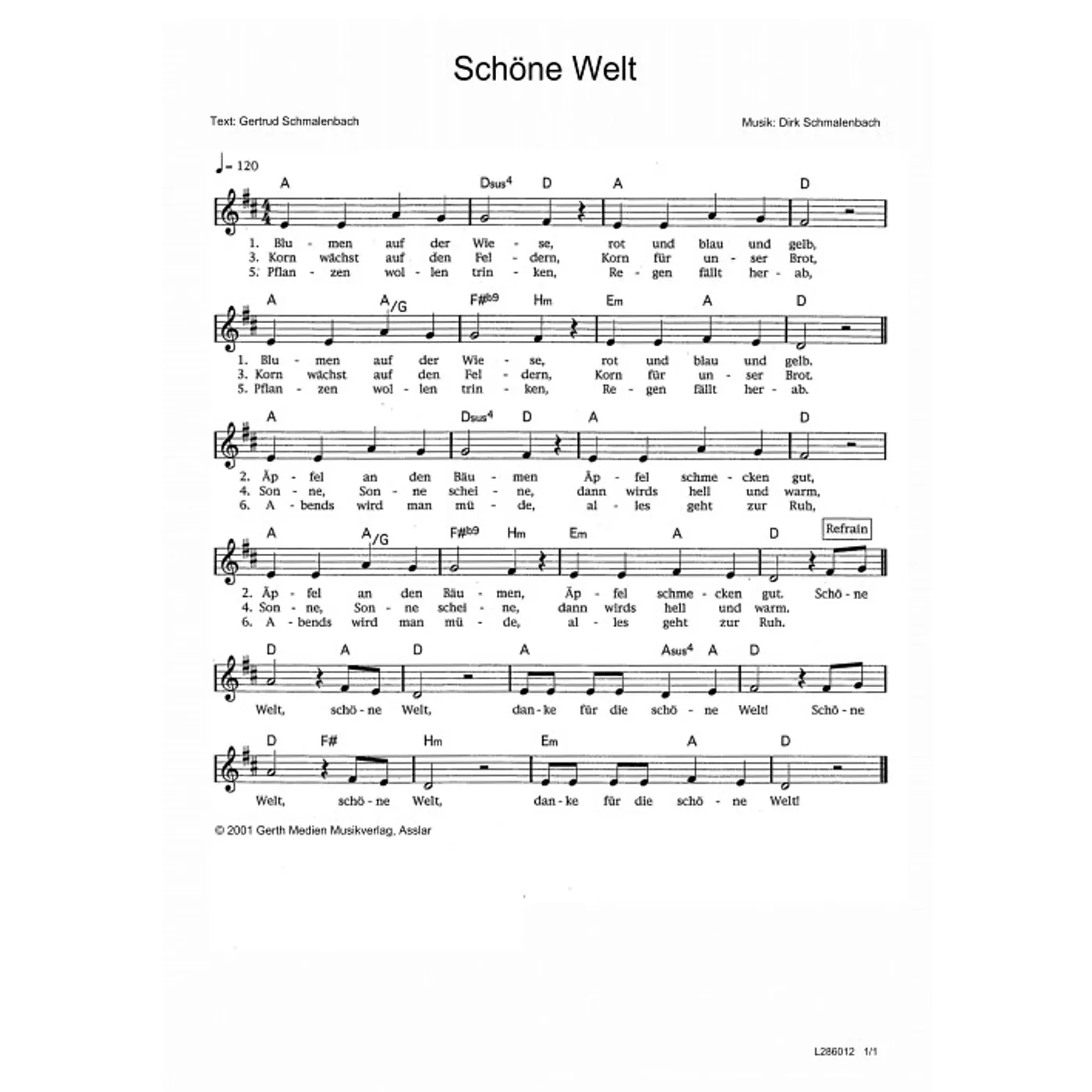 Schöne Welt (diese Variante haben Sie gerade ausgewählt) (einstimmig, mit Akkorden, D-Dur) Gertrud Schmalenbach (Text), Dirk Schmalenbach (Komposition) |