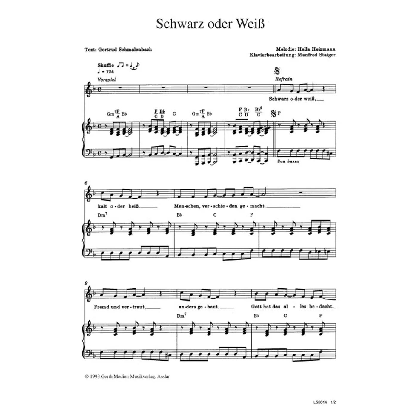 Schwarz oder weiss (diese Variante haben Sie gerade ausgewählt) (Klavier, einstimmig, mit Akkorden, F-Dur) Hella Heizmann (Komposition), Gertrud Schmalenbach (Text), Manfred Staiger (Klaviersatz) |