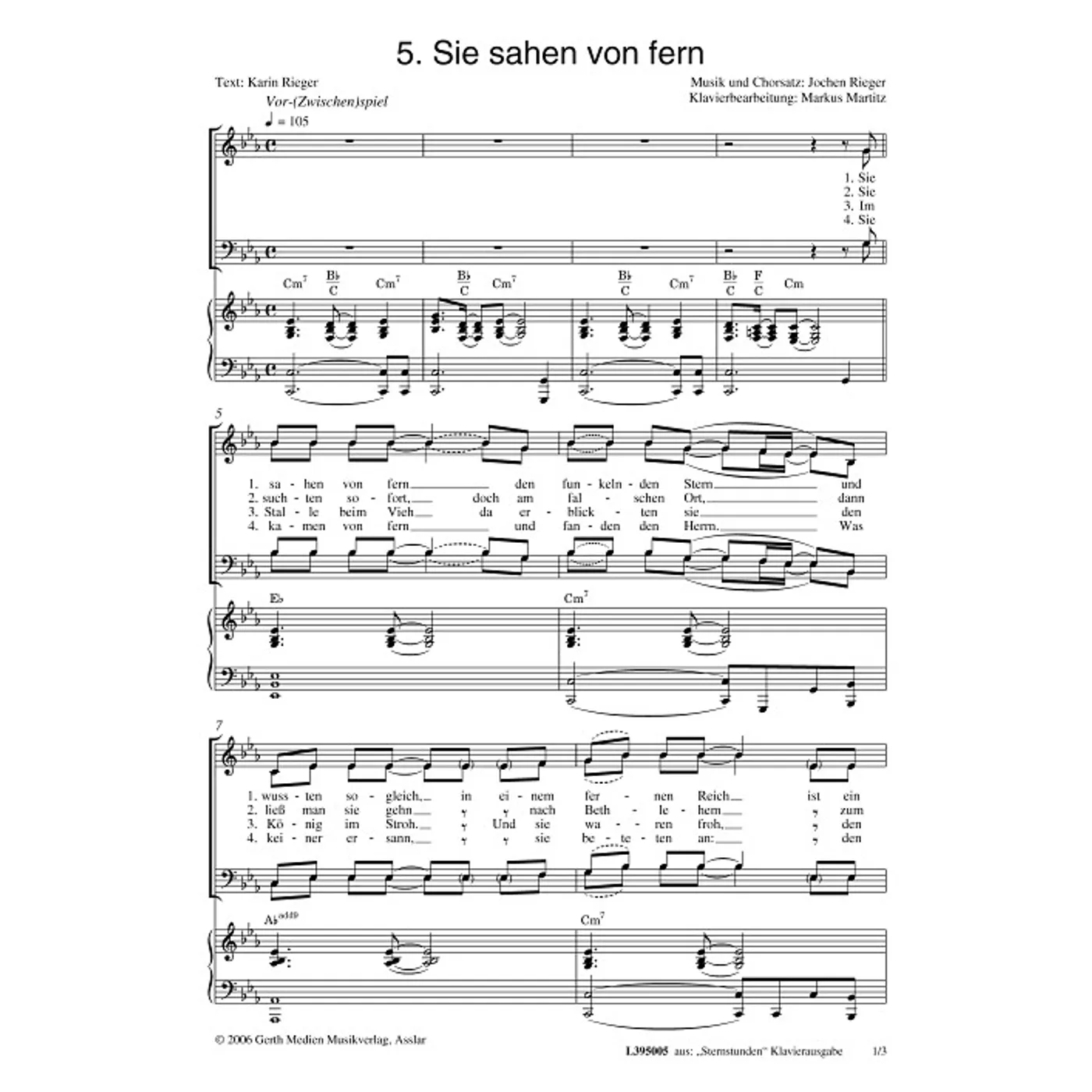 Sie sahen von fern (diese Variante haben Sie gerade ausgewählt) (modern, Klavier, dreistimmig, gemischter Chor, mit Akkorden, C-Moll) Jochen Rieger (Komposition, Chorsatz), Karin Rieger (Text), Markus Martitz (Klaviersatz) |