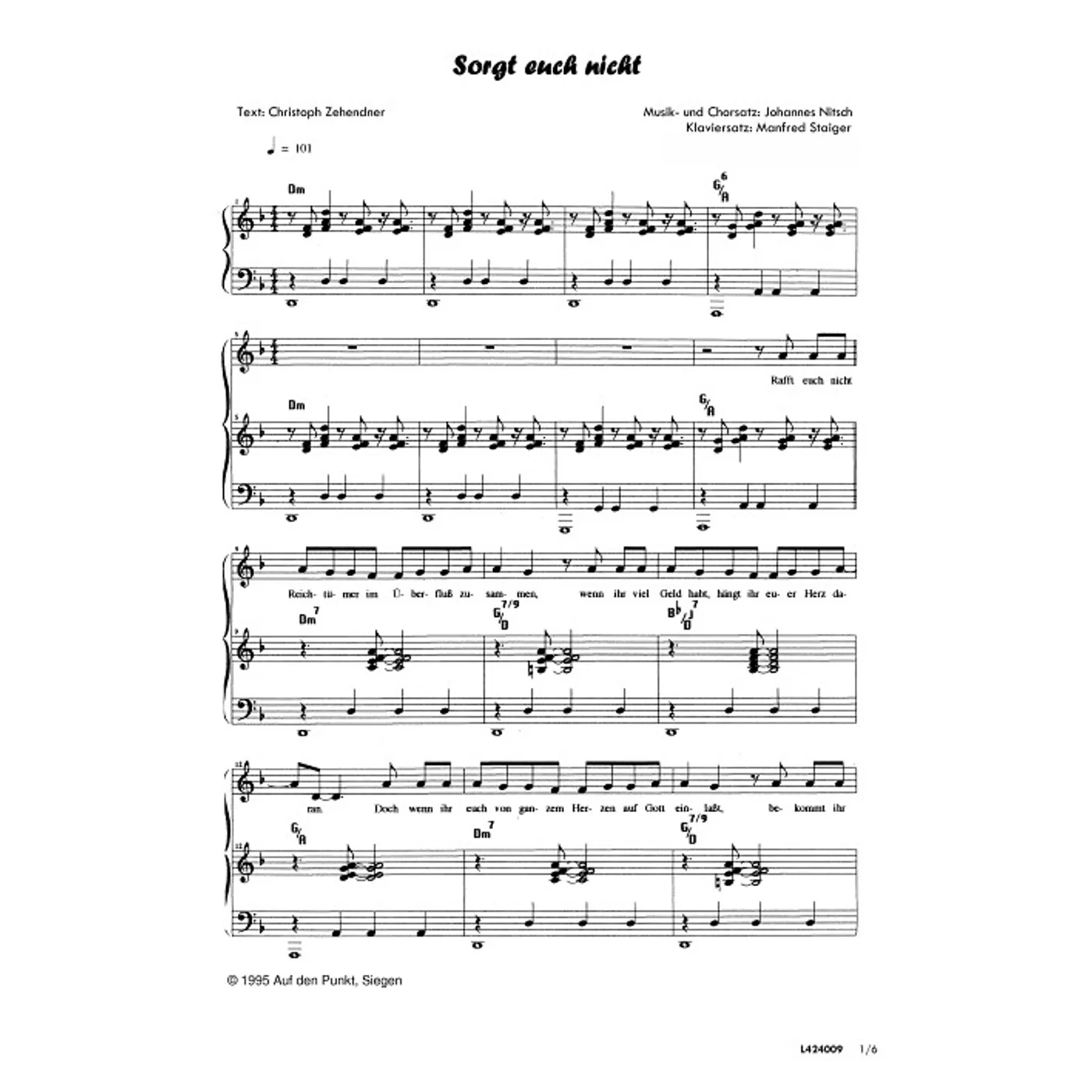 Sorgt euch nicht (diese Variante haben Sie gerade ausgewählt) (modern, Klavier, dreistimmig, gemischter Chor, mit Akkorden, D-Moll) Johannes Nitsch (Komposition, Chorsatz), Christoph Zehendner (Text), Manfred Staiger (Klaviersatz) |