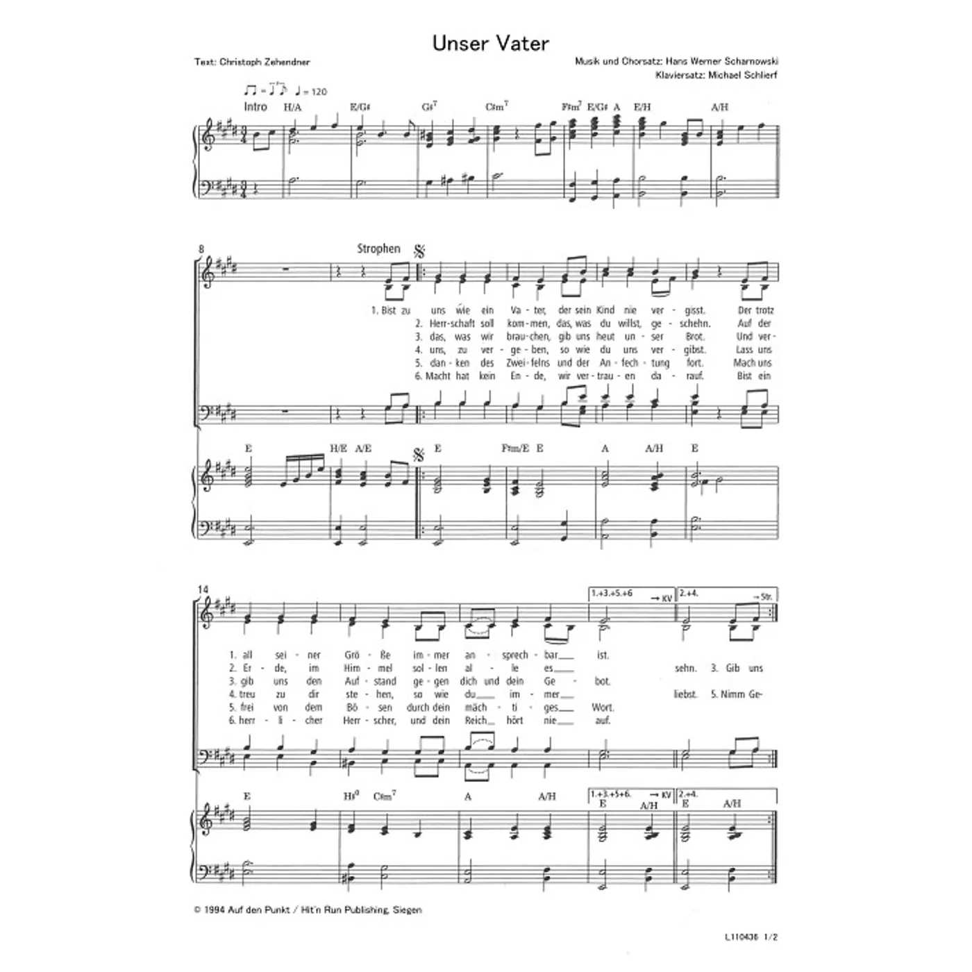 Unser Vater (diese Variante haben Sie gerade ausgewählt) (modern, Klavier, gemischter Chor, mit Akkorden, vierstimmig, E-Dur) Hans Werner Scharnowski (Komposition, Chorsatz), Christoph Zehendner (Text), Michael Schlierf (Klaviersatz) |