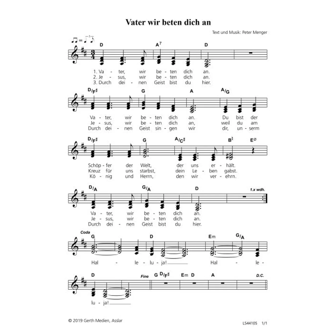 Vater, wir beten dich an (diese Variante haben Sie gerade ausgewählt) (Gemeindelied, modern, dreistimmig, mit Akkorden, D-Dur) Peter Menger (Komposition, Text) |