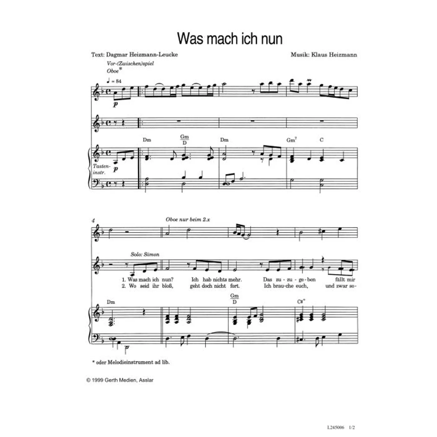 Was mach ich nun (diese Variante haben Sie gerade ausgewählt) (Kinderchor, Klavier, einstimmig, mit Akkorden, D-Moll) Klaus Heizmann (Komposition), Dagmar Heizmann-Leucke (Text) |