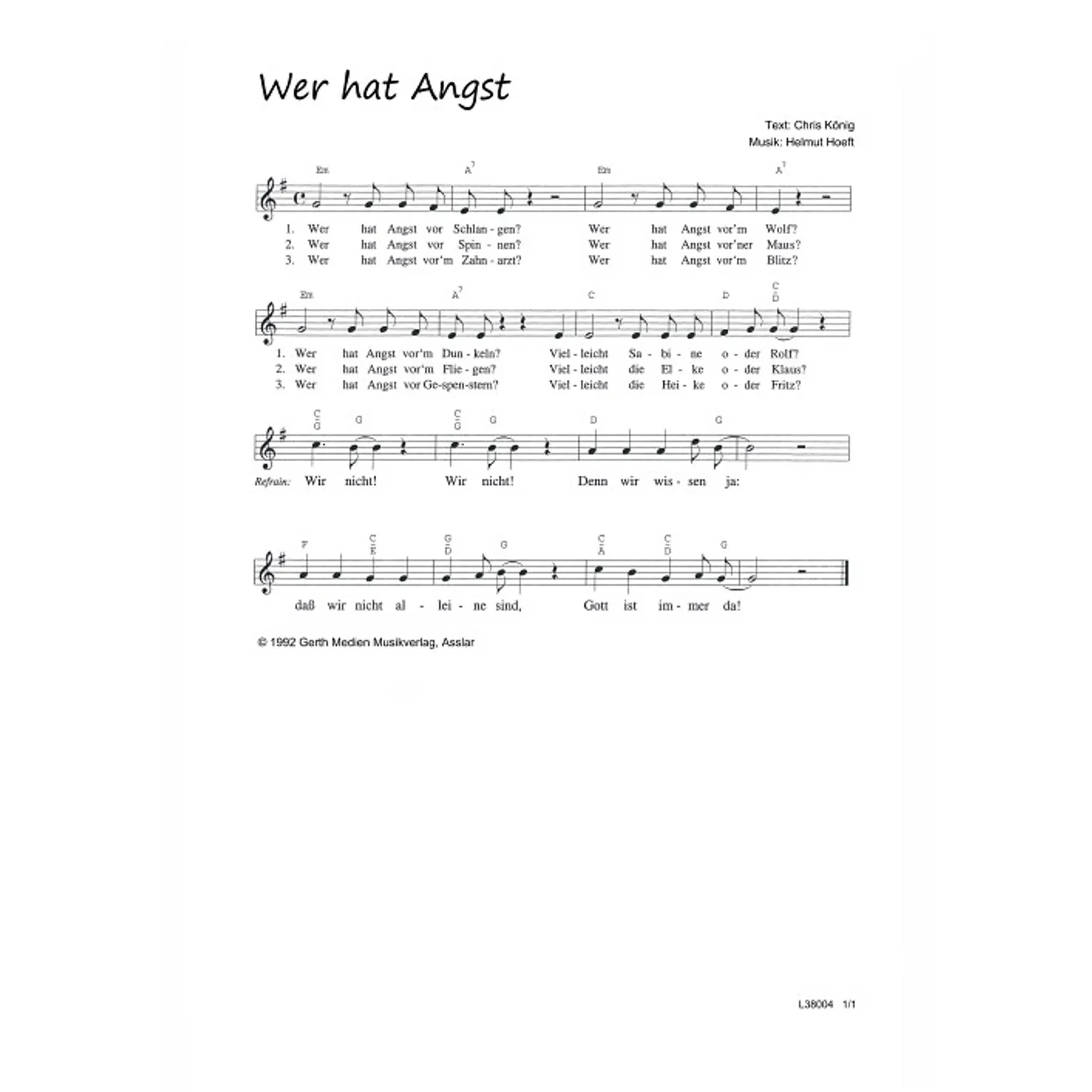 Wer hat Angst (diese Variante haben Sie gerade ausgewählt) (einstimmig, mit Akkorden, E-Moll) Helmut Hoeft (Komposition), Chris König (Text) |